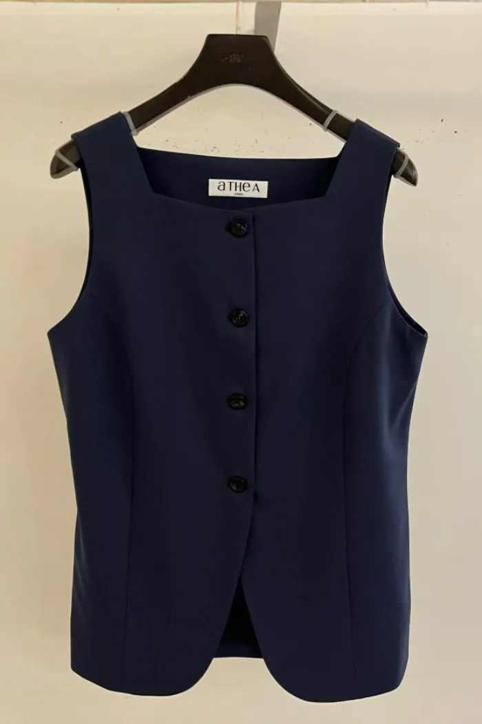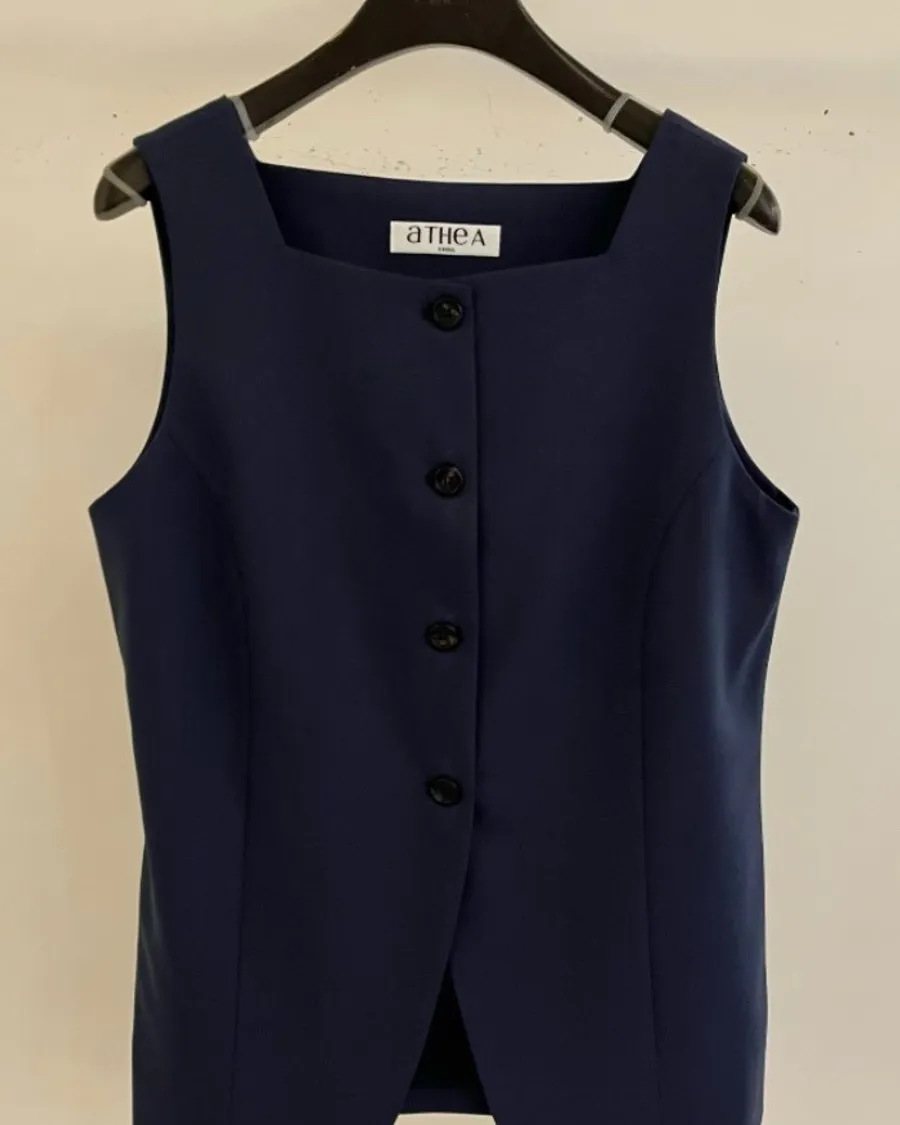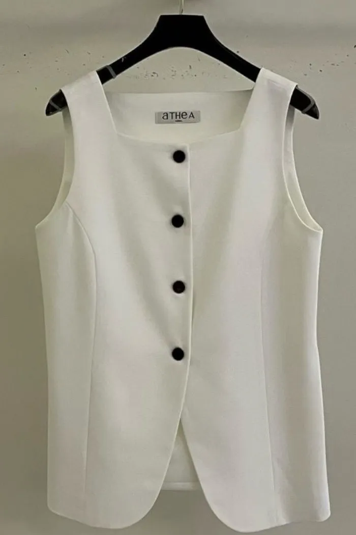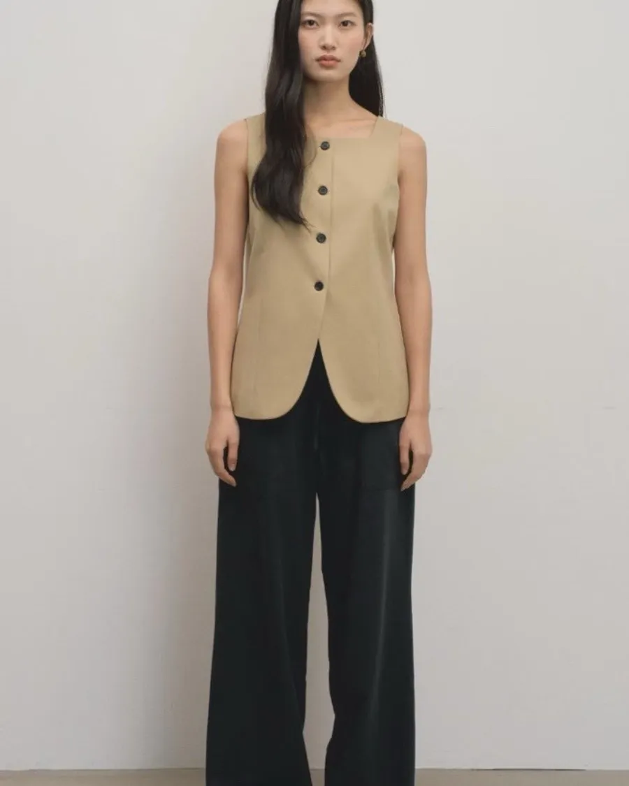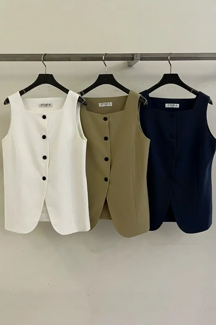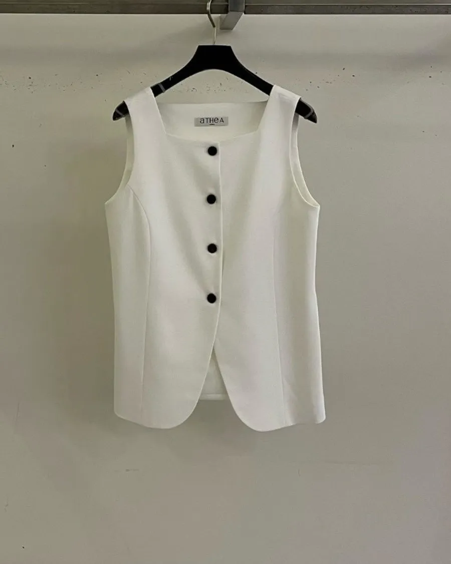 版型上採用立體剪裁,貼合身形但不過於緊繃,兼具舒適與俐落感。單穿即可展現極簡時尚風格,也能搭配襯衫或西裝外套,打造多層次穿搭。這類方領與排扣設計在現代背心中常被用來營造俐落與優雅的造型感