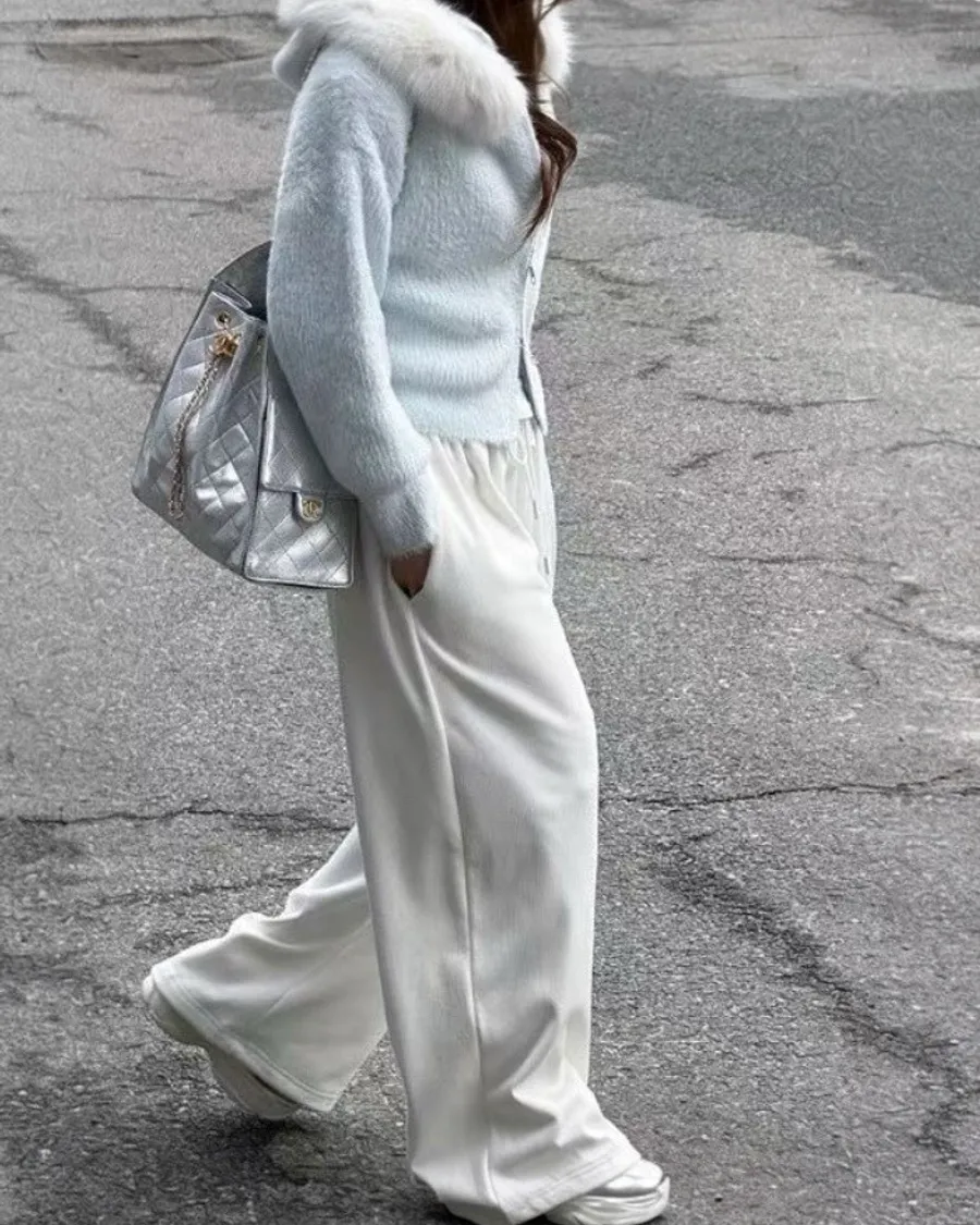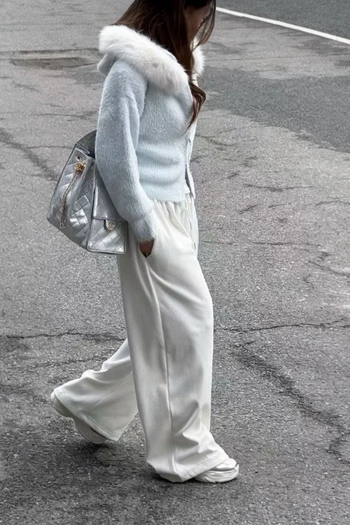 布料柔軟帶霧感,自然垂墜、不貼腿,走路時線條很順,