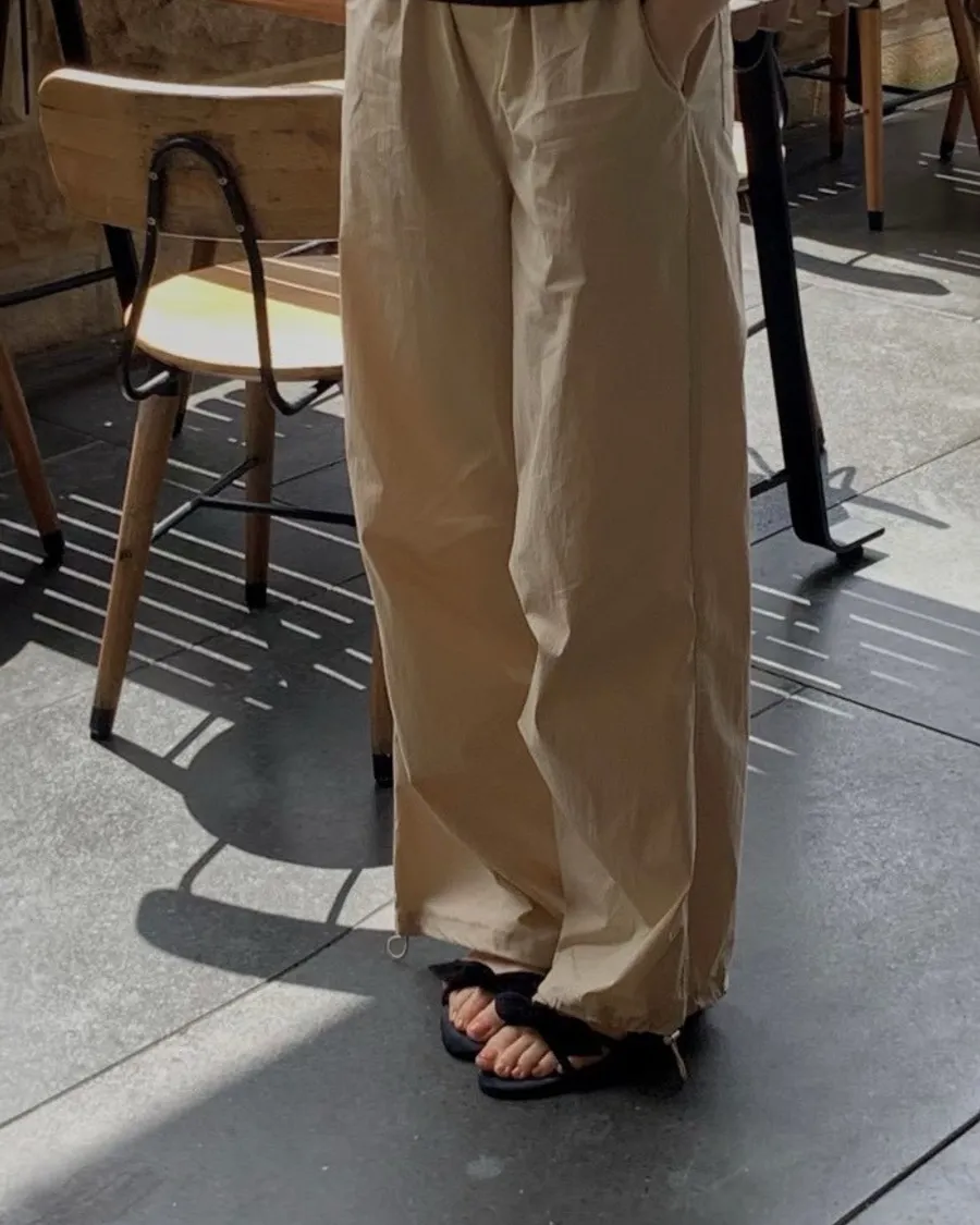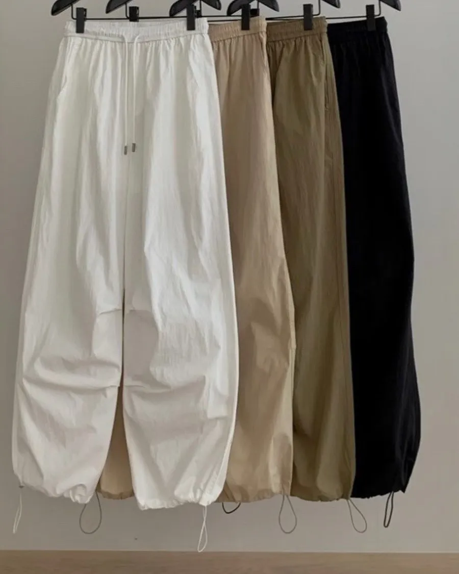 腰部鬆緊搭配抽繩設計,兼顧舒適與實穿性;褲腳可調節收束,讓輪廓在寬鬆與俐落之間自由轉換,行走時自然形成份量感與空氣感。