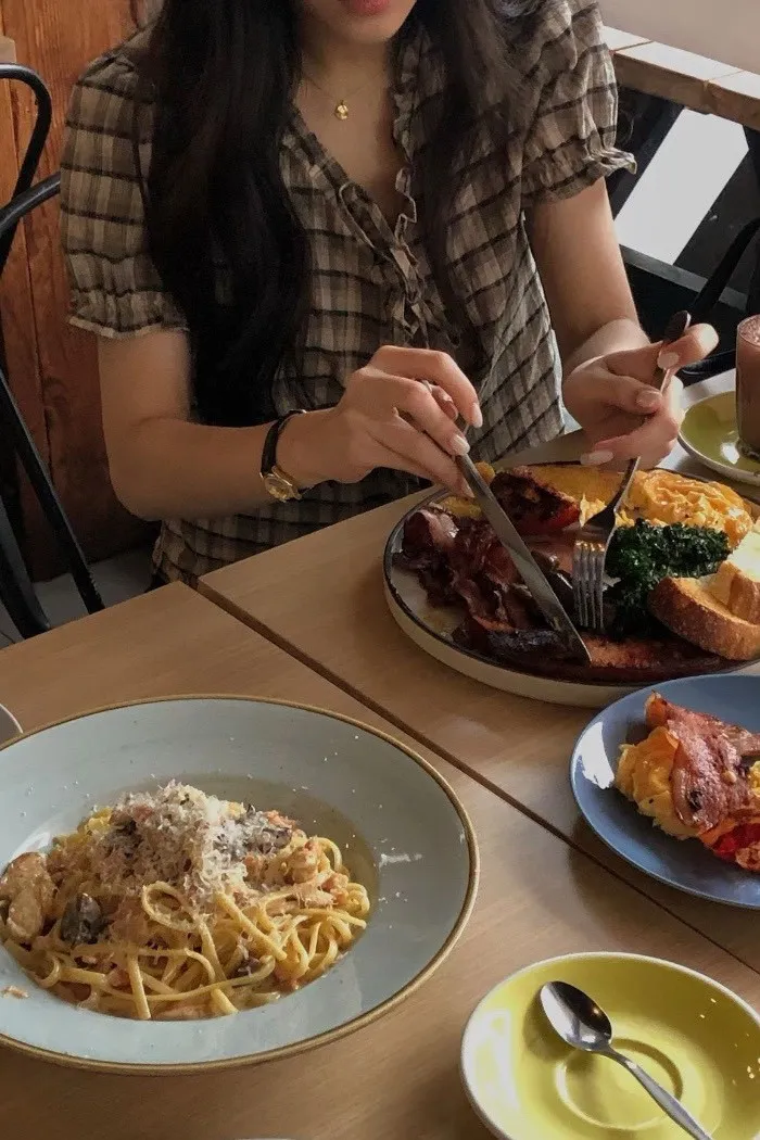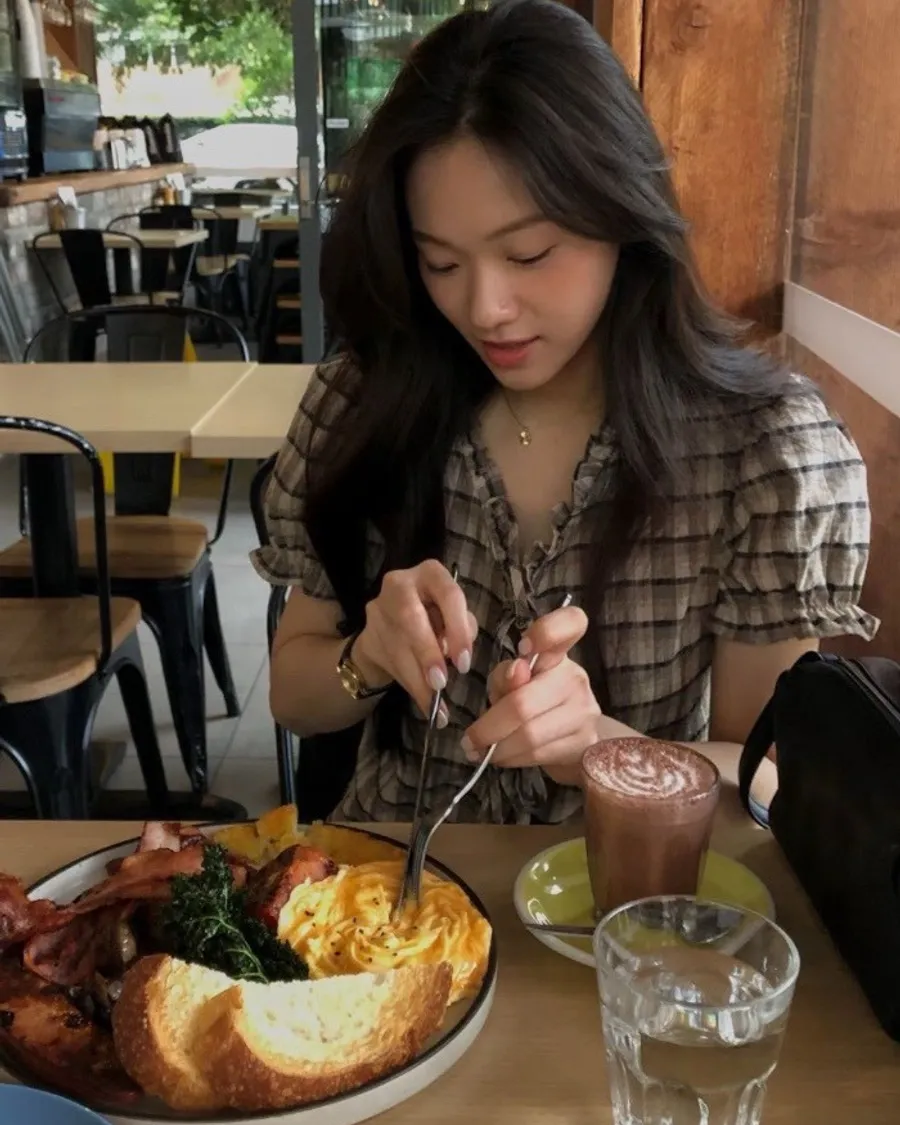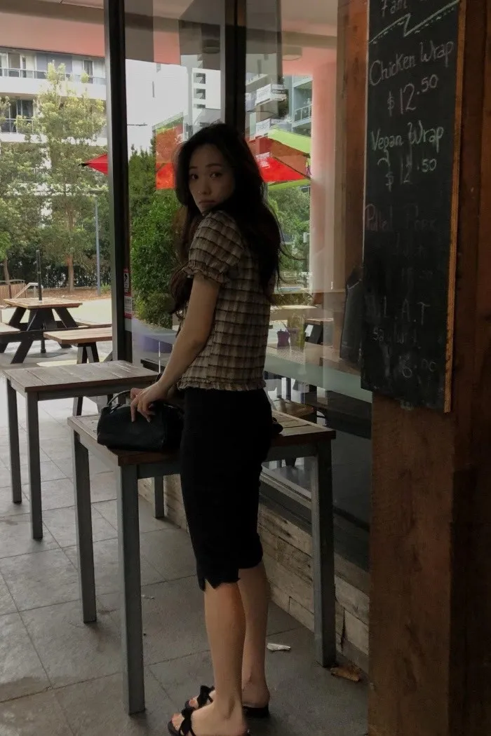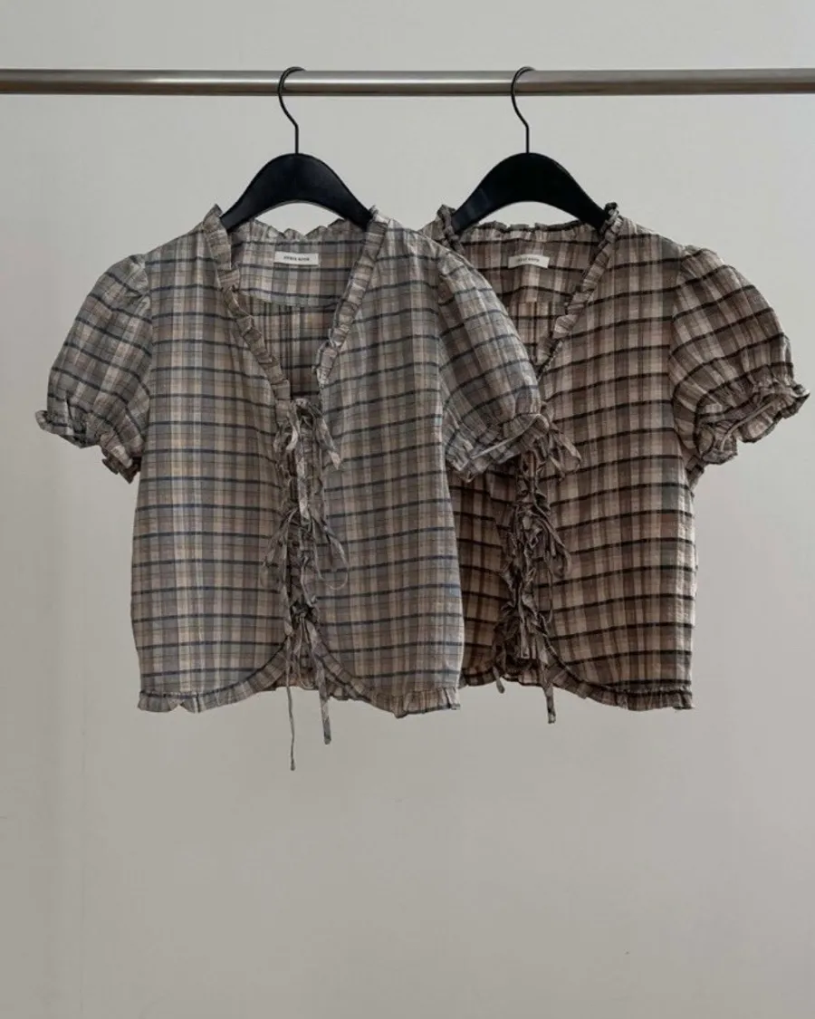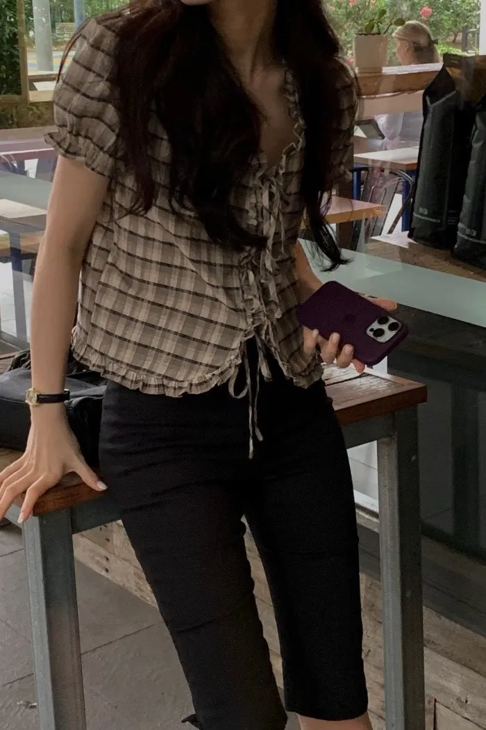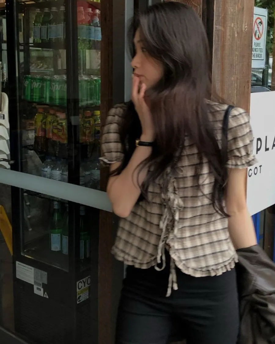 以細緻格紋為基底,結合抓皺與綁帶設計,呈現柔和且帶有復古氣息的上身輪廓。