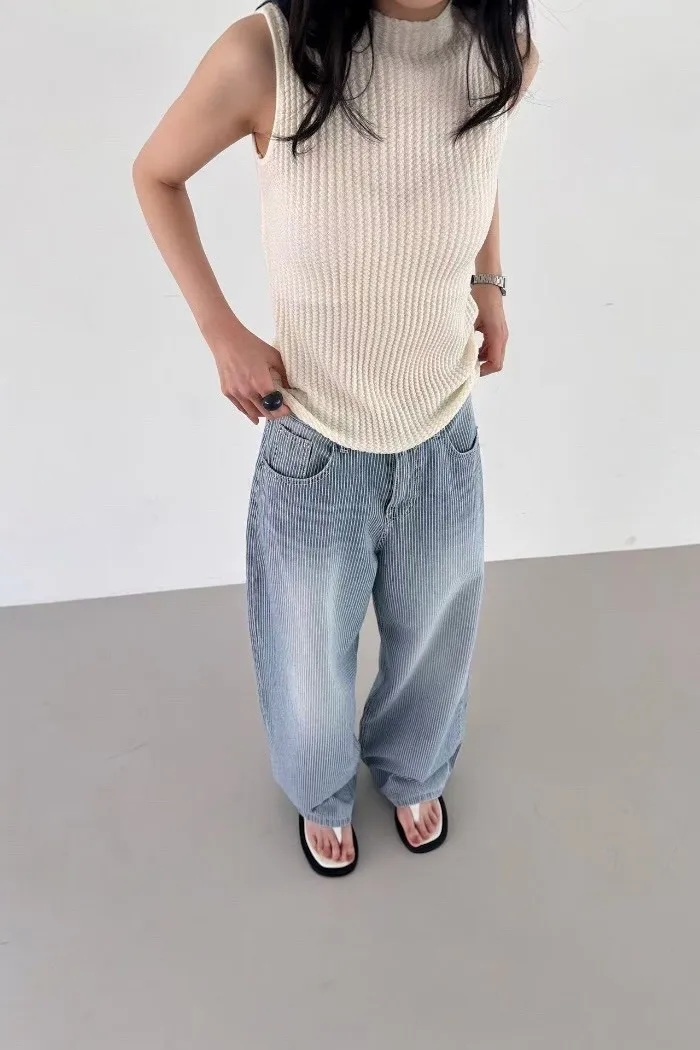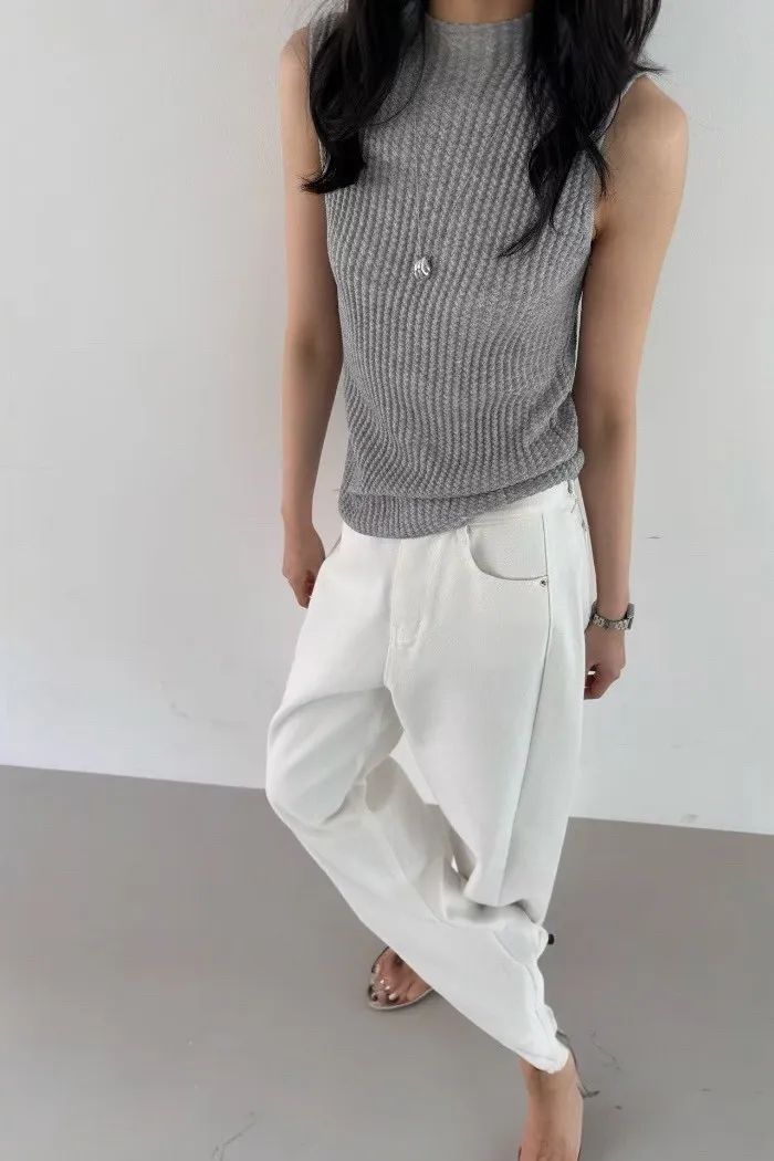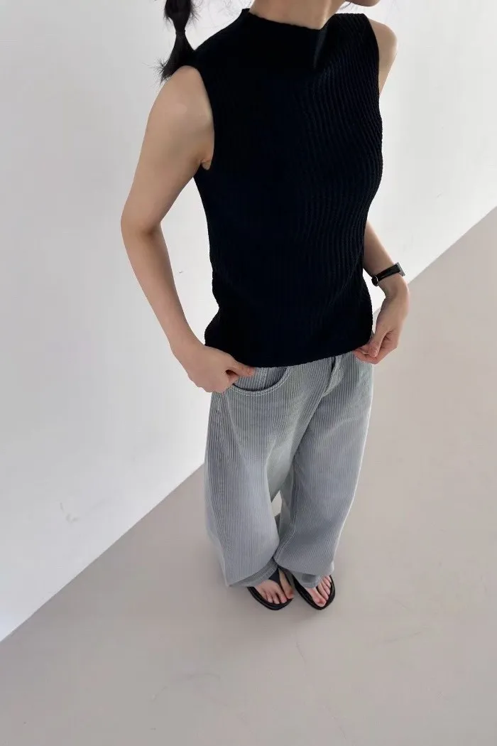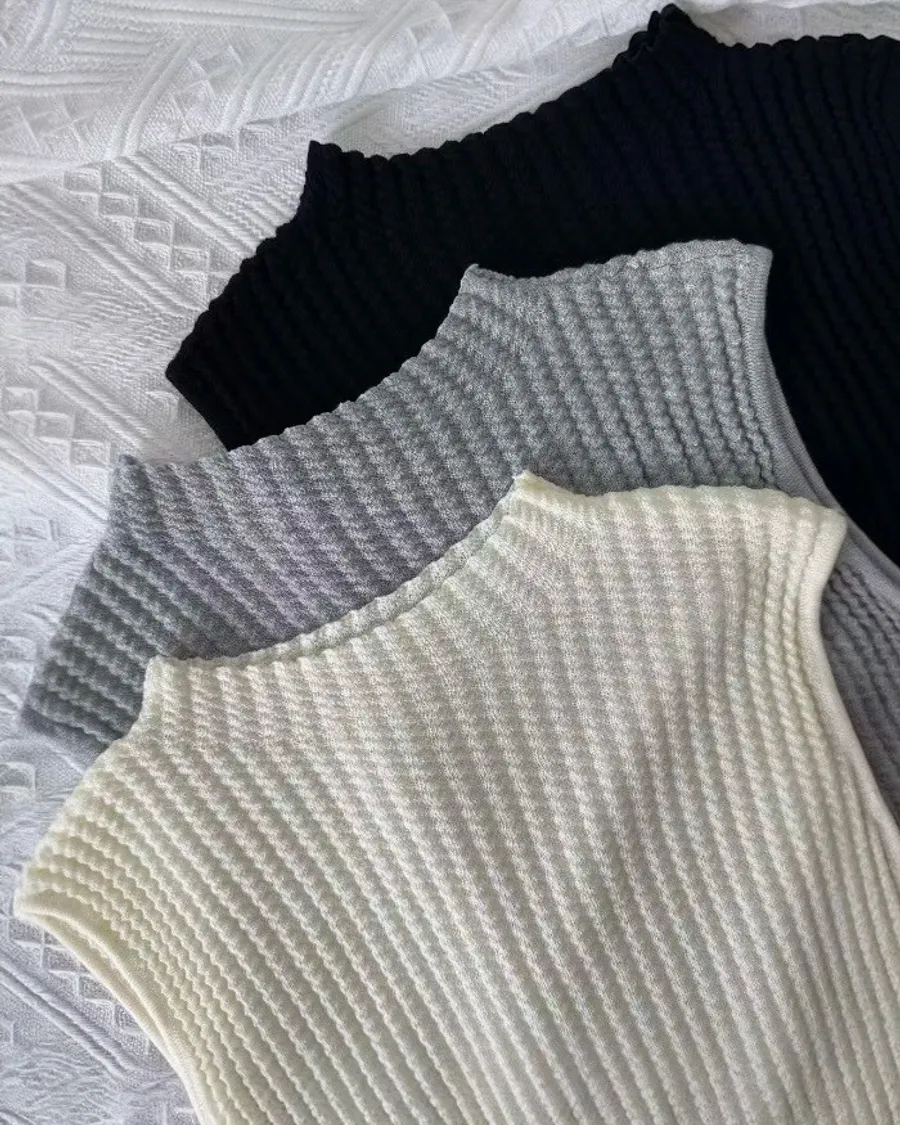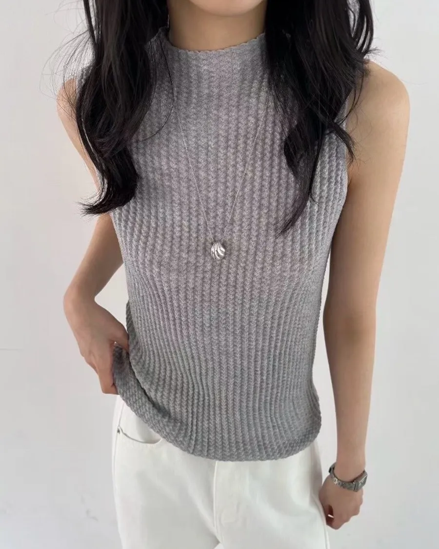 這款立領無袖羅紋針織上衣,以細緻立體的羅紋織紋打造俐落線條,修飾身形比例,呈現乾淨利落的高級質感。
