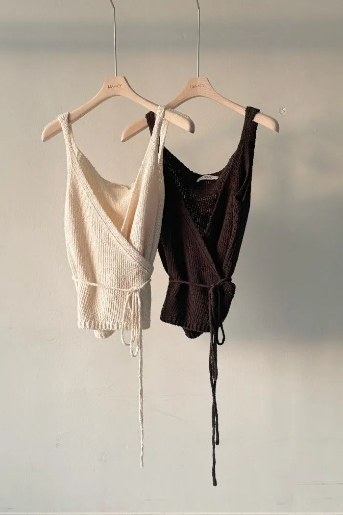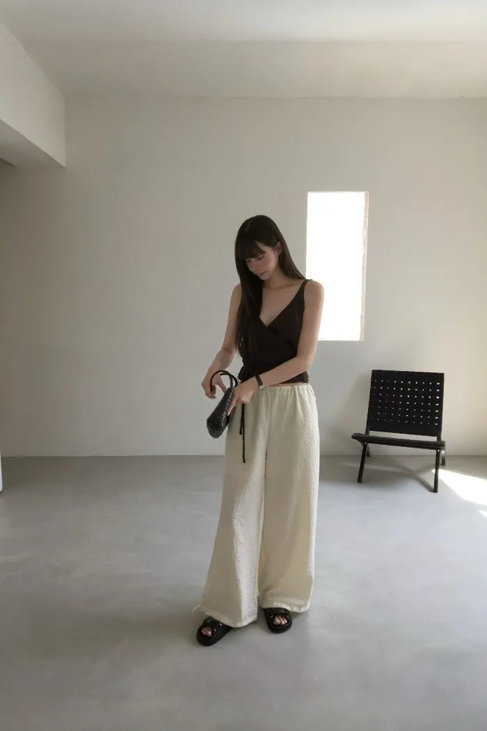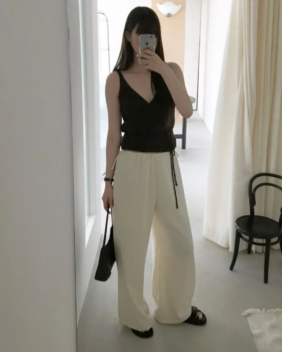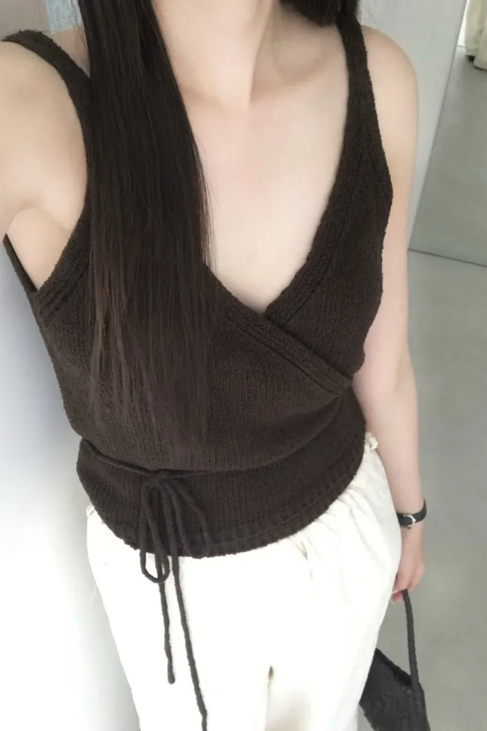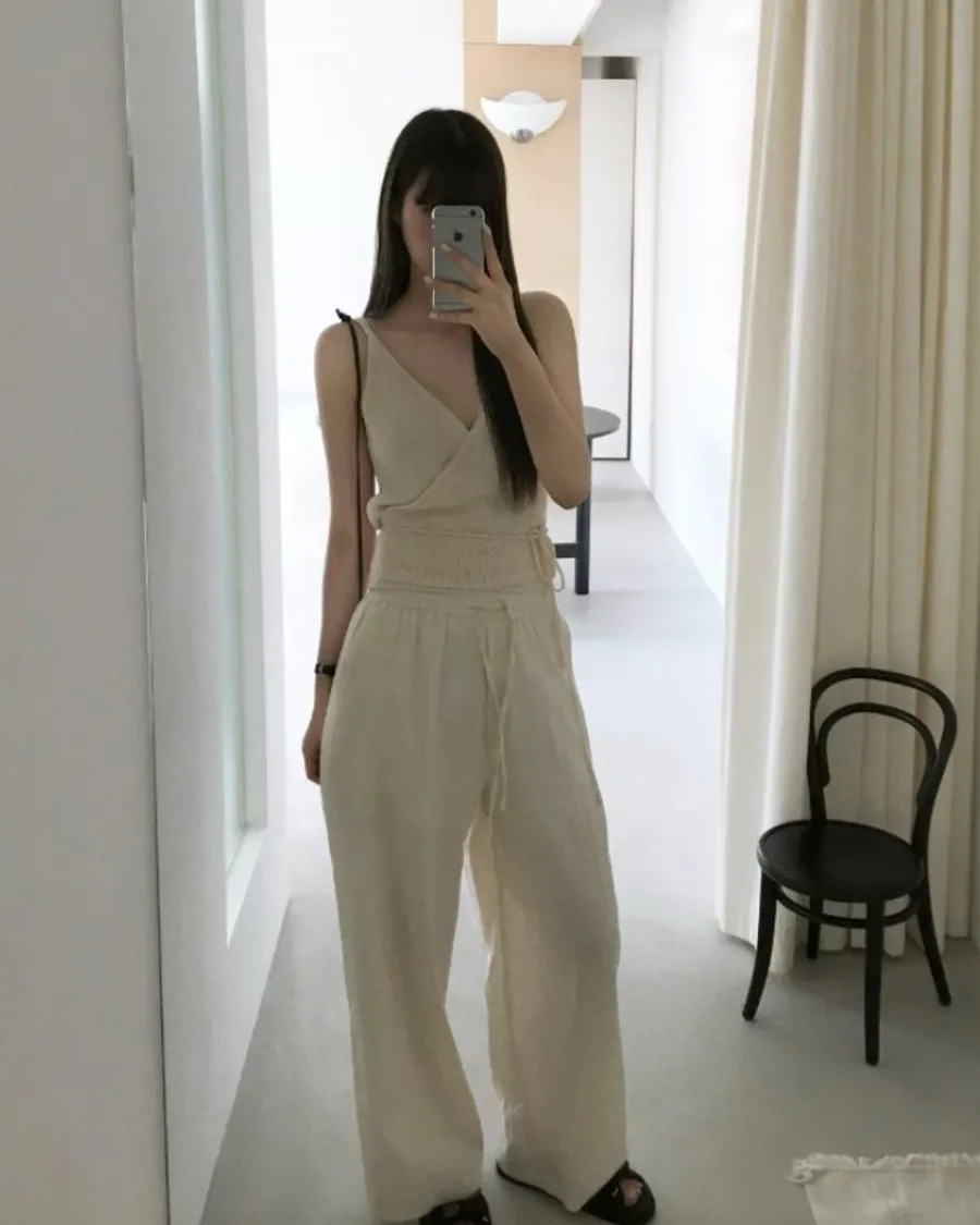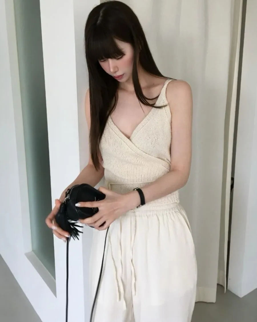 運用交叉包覆的V領線條,自然勾勒鎖骨與肩頸比例,展現低調卻精緻的女性輪廓