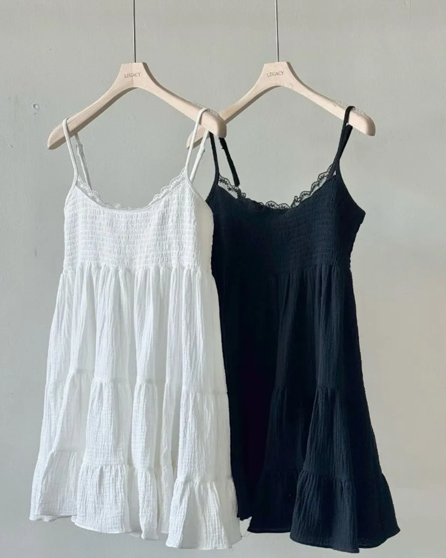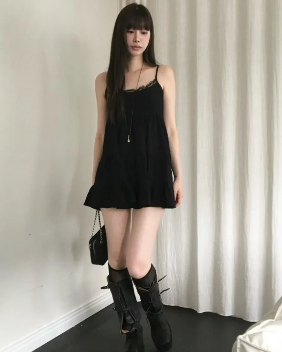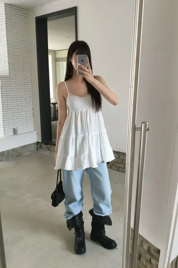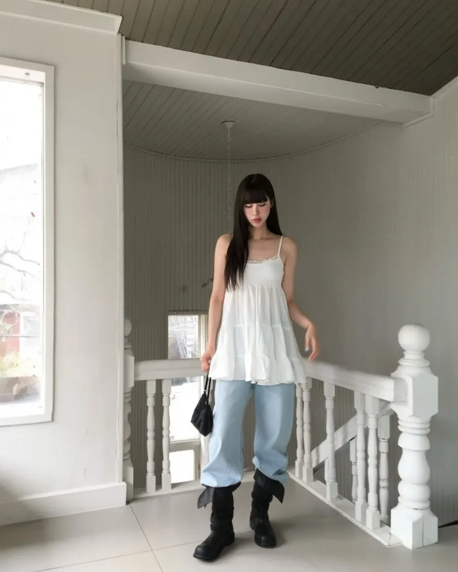 多層次傘狀剪裁展開,隨步伐自然擺動,呈現輕盈且帶有空氣感的輪廓。整體比例刻意拉長,可單穿作為小洋裝,也可搭配牛仔或寬褲,轉換為日常上衣造型。