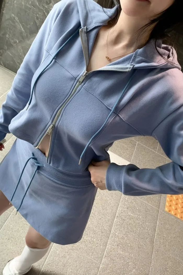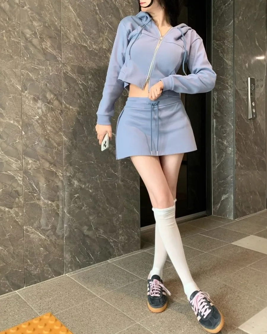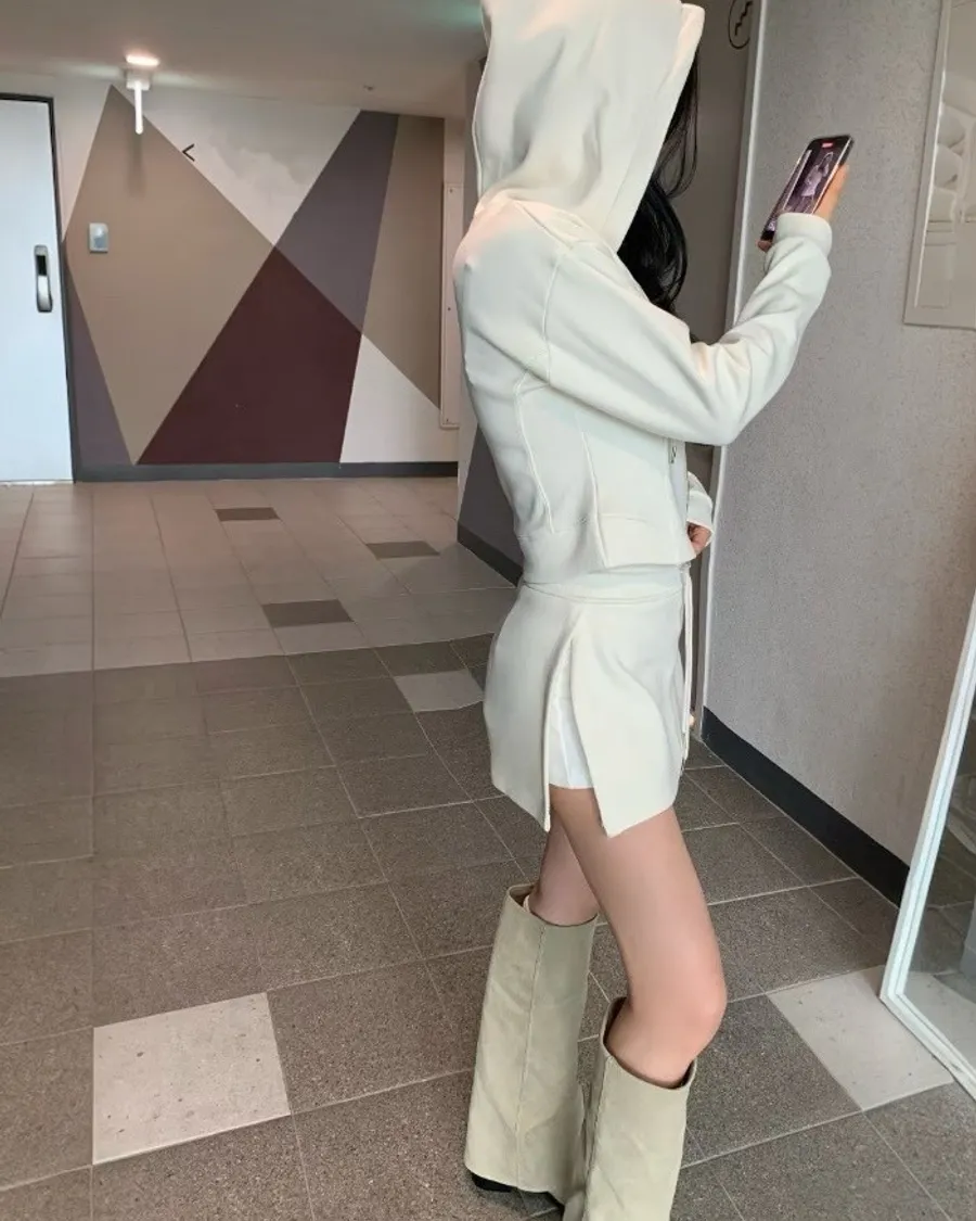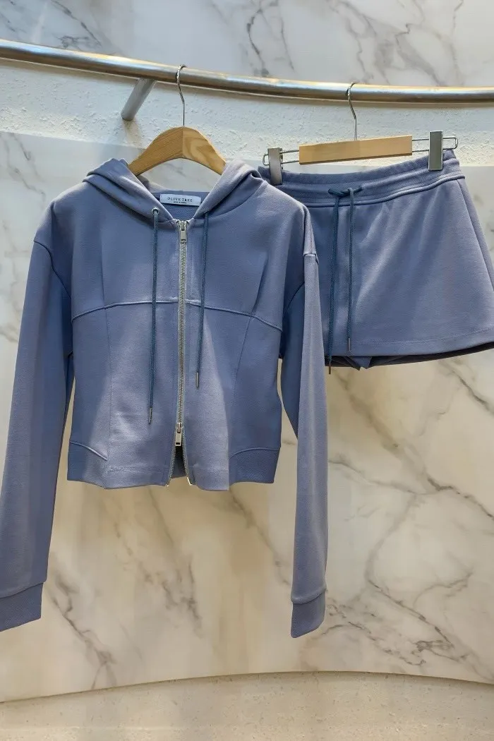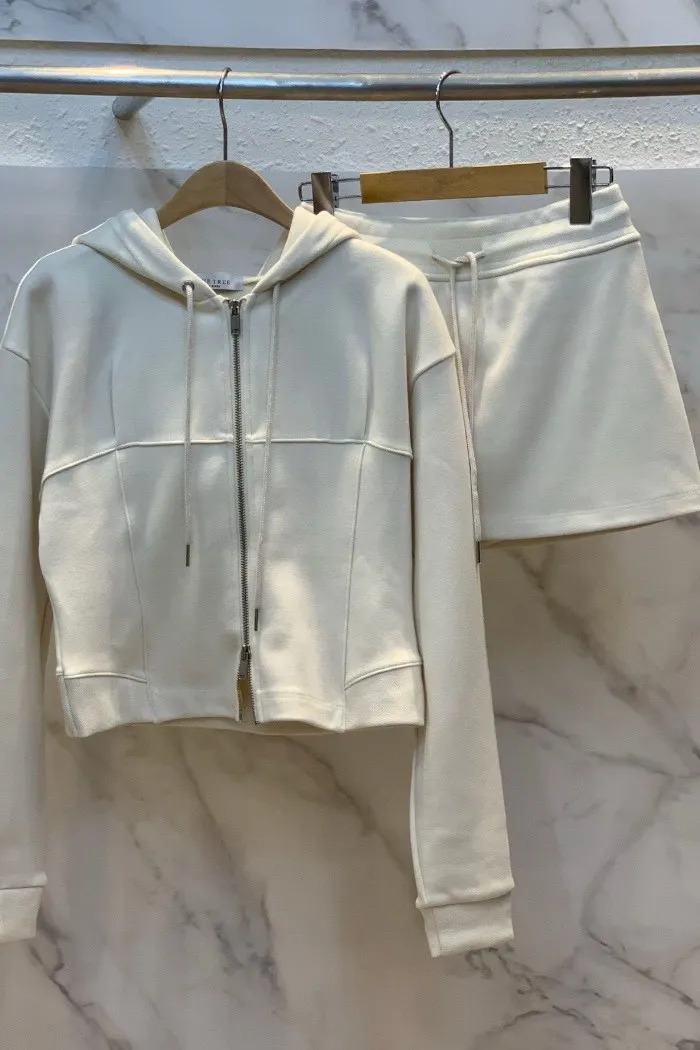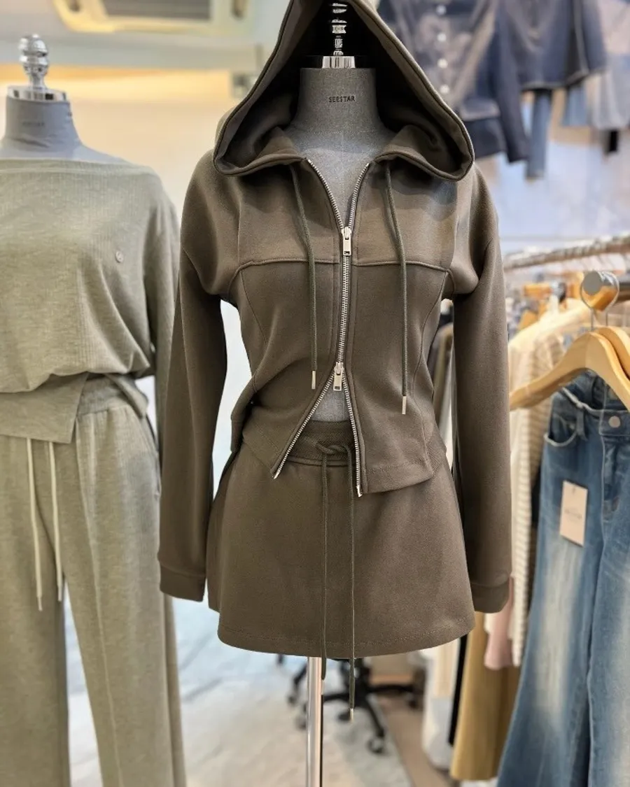 短版連帽外套結合雙向拉鍊設計,隨著開合之間,輕鬆調整比例與層次感,讓腰線更加明確,視覺上更顯修長。搭配同色系高腰短裙(內含安全褲),在柔軟布料包覆下,同時保有俐落輪廓與活動自在。