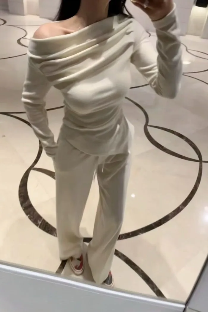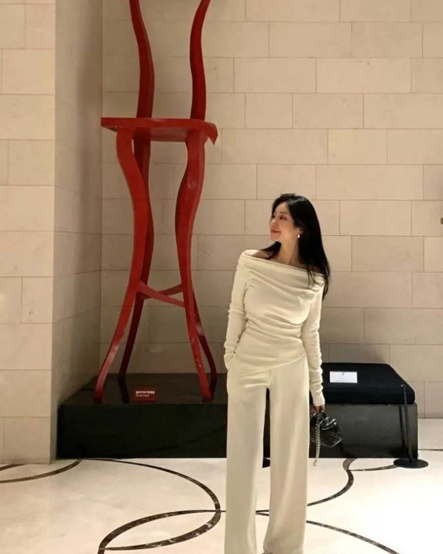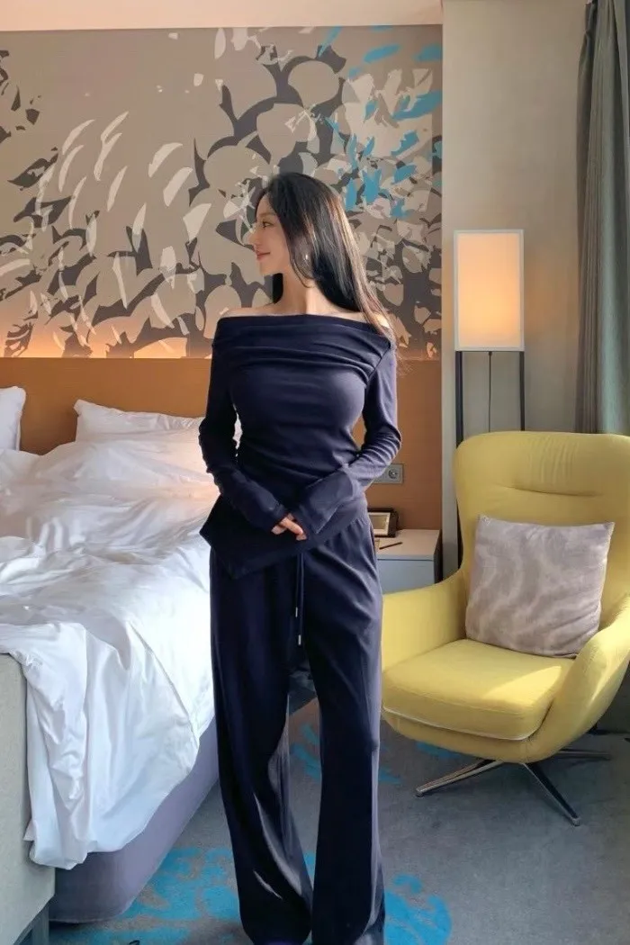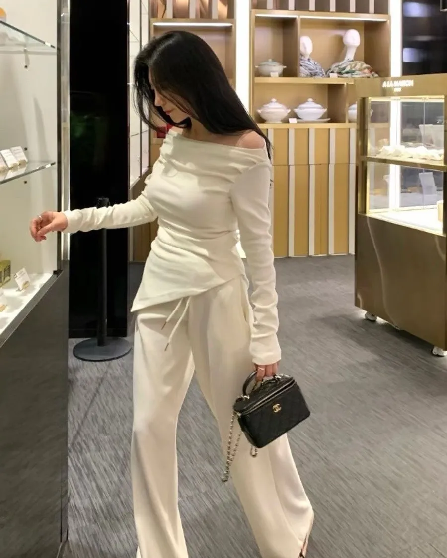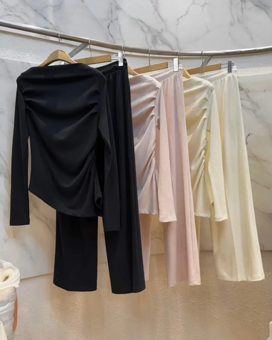 這款套裝以斜肩垂墜設計為主軸,透過自然堆疊的布料線條,柔和地勾勒出肩頸與鎖骨曲線,展現出低調卻極具質感的女人氣場。