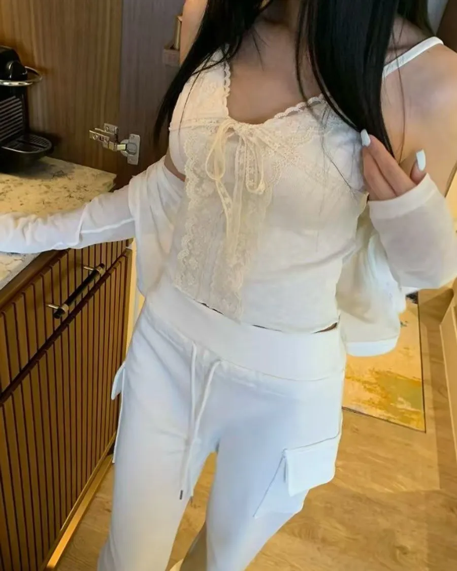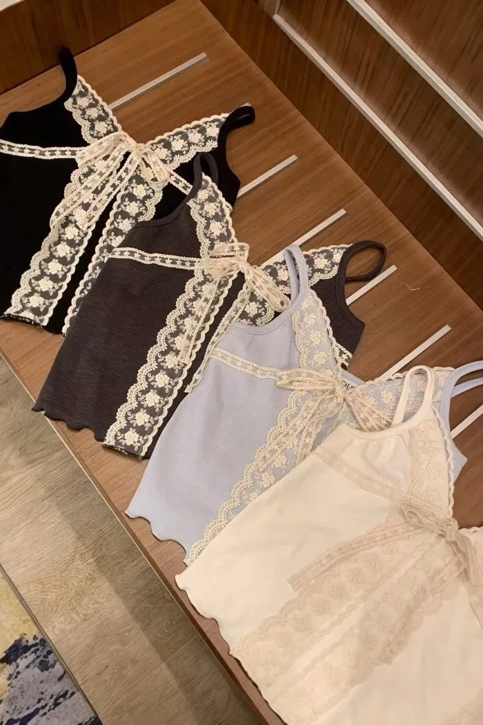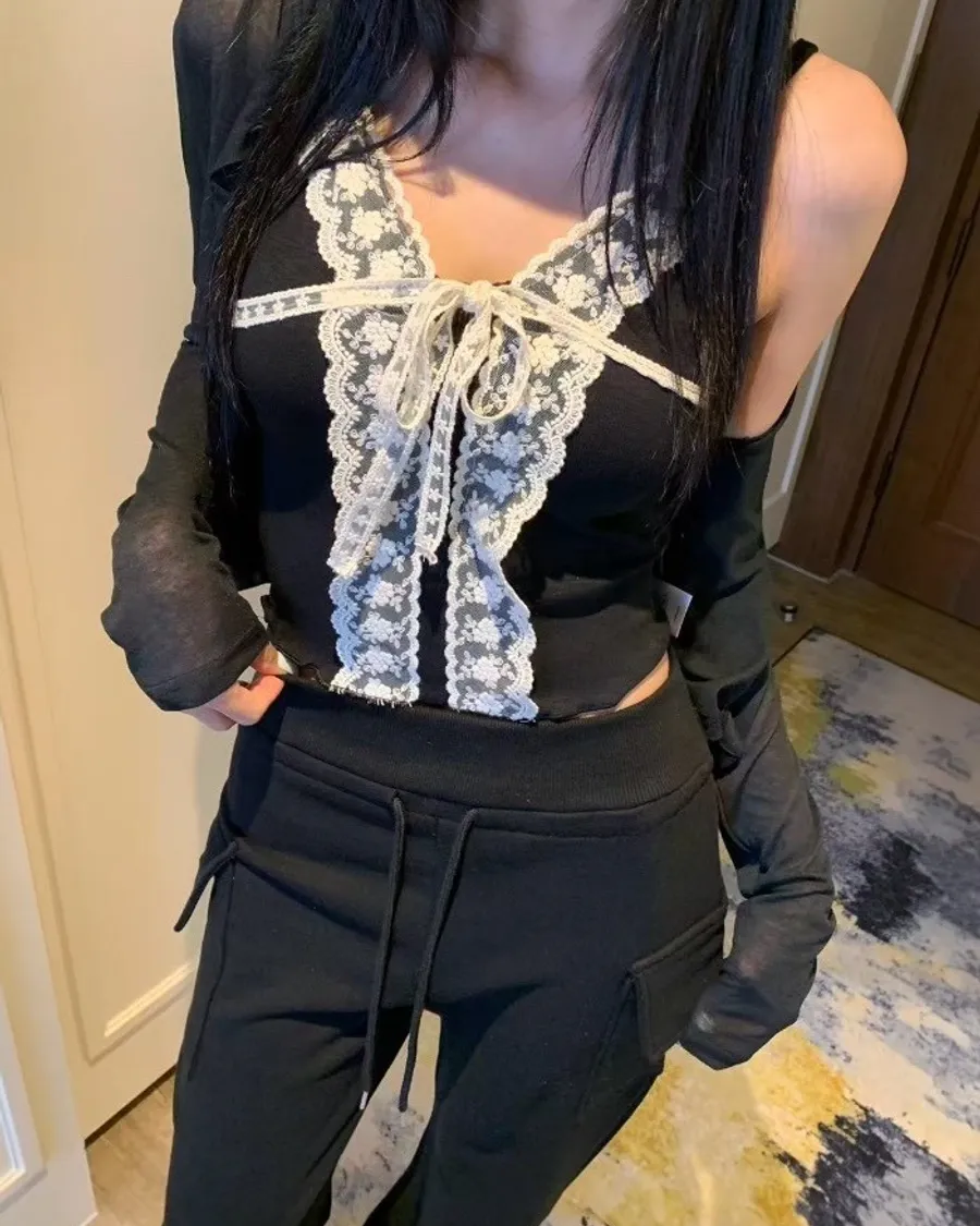 選用細緻立體蕾絲拼接,從胸前延伸至中線,打造自然修飾線條的視覺效果,搭配手工感綁帶設計,在甜美之中多了一點恰到好處的性感。