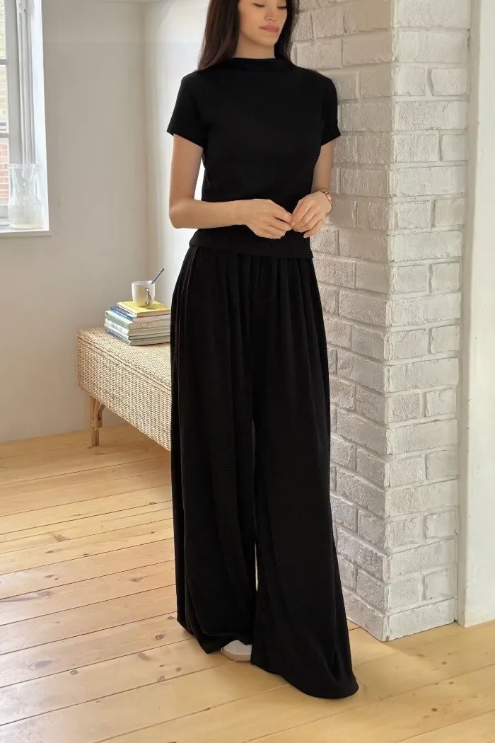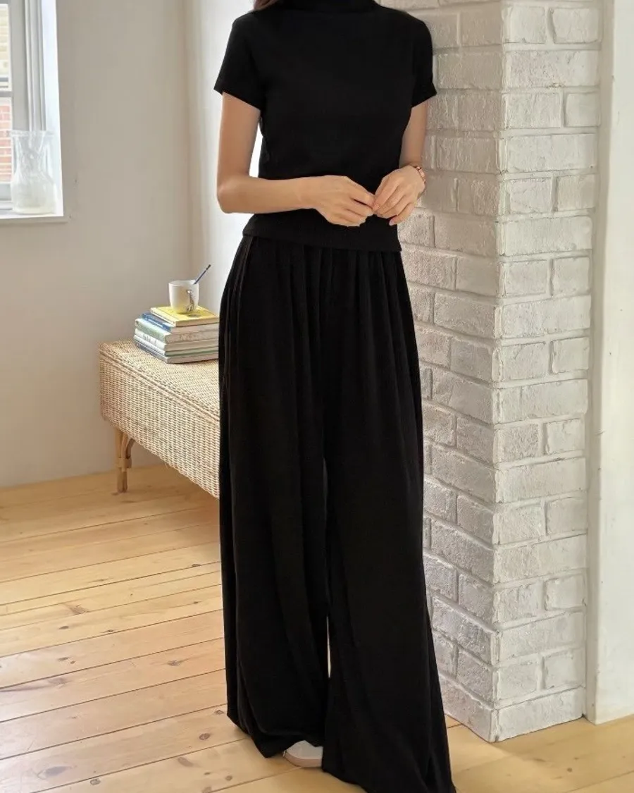 上身為貼身微高領短袖設計,修飾肩頸線條,同時保持舒適與俐落;下身高腰寬版褲型順著身形自然垂墜,拉長腿部比例,讓整體線條顯得更加修長優雅。