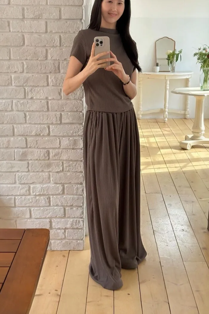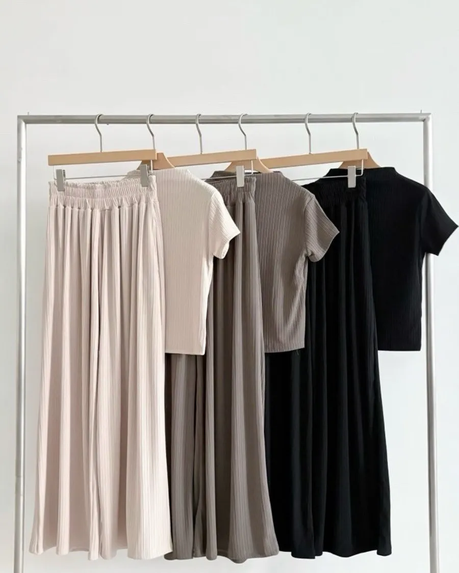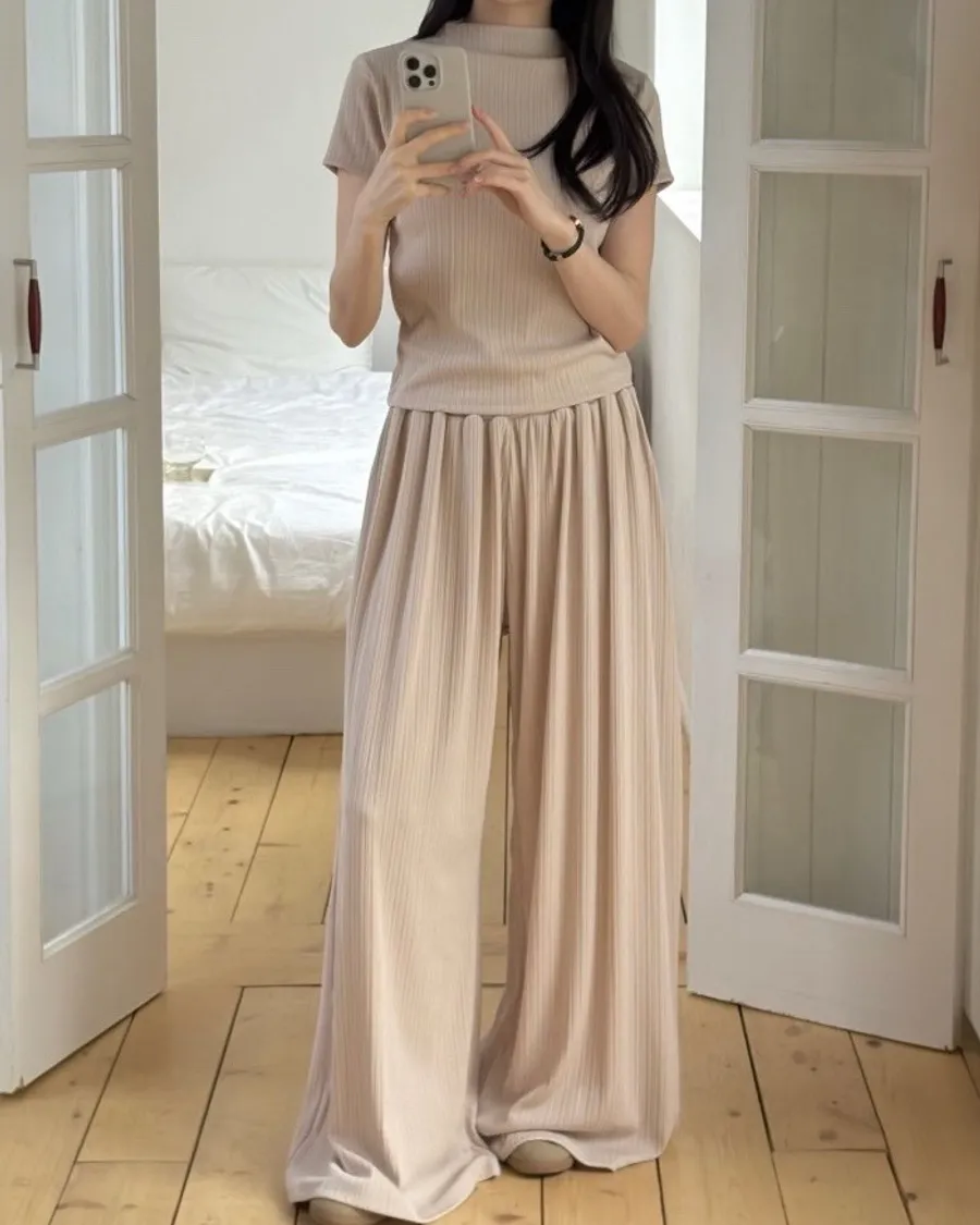 細緻的立體直紋針織面料,搭配流動感寬褲剪裁,呈現出簡約卻極具氣質的日常風格。