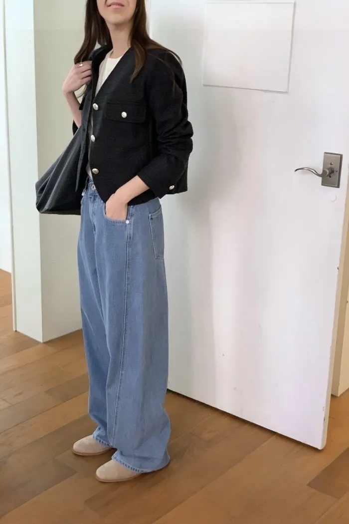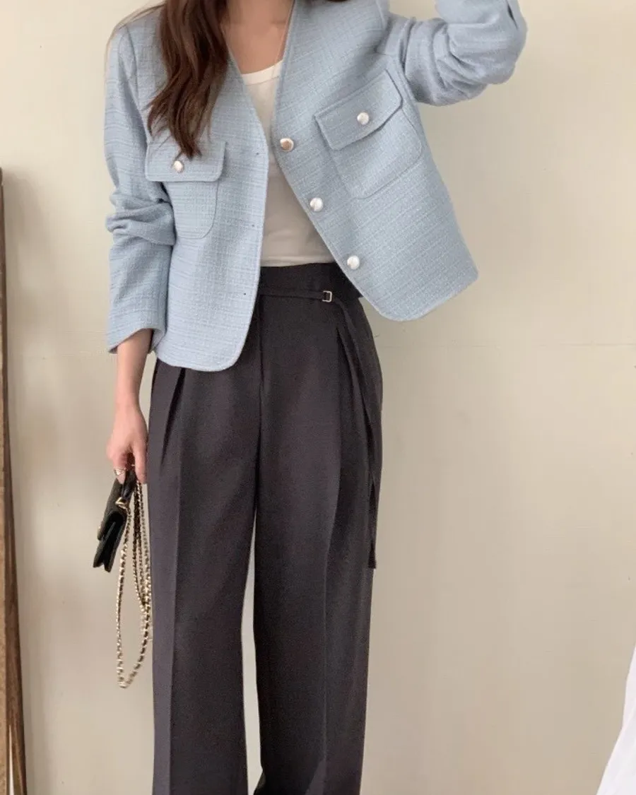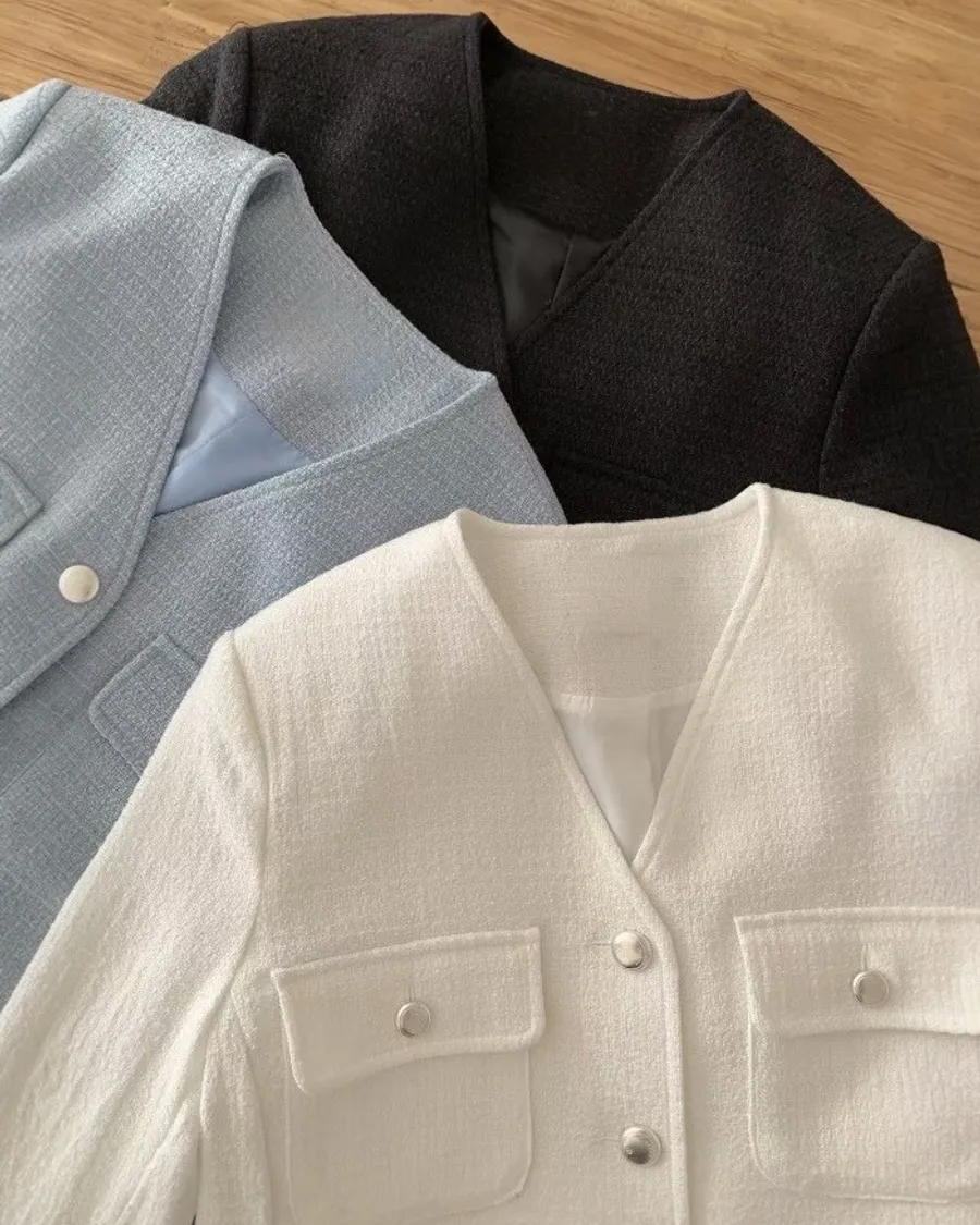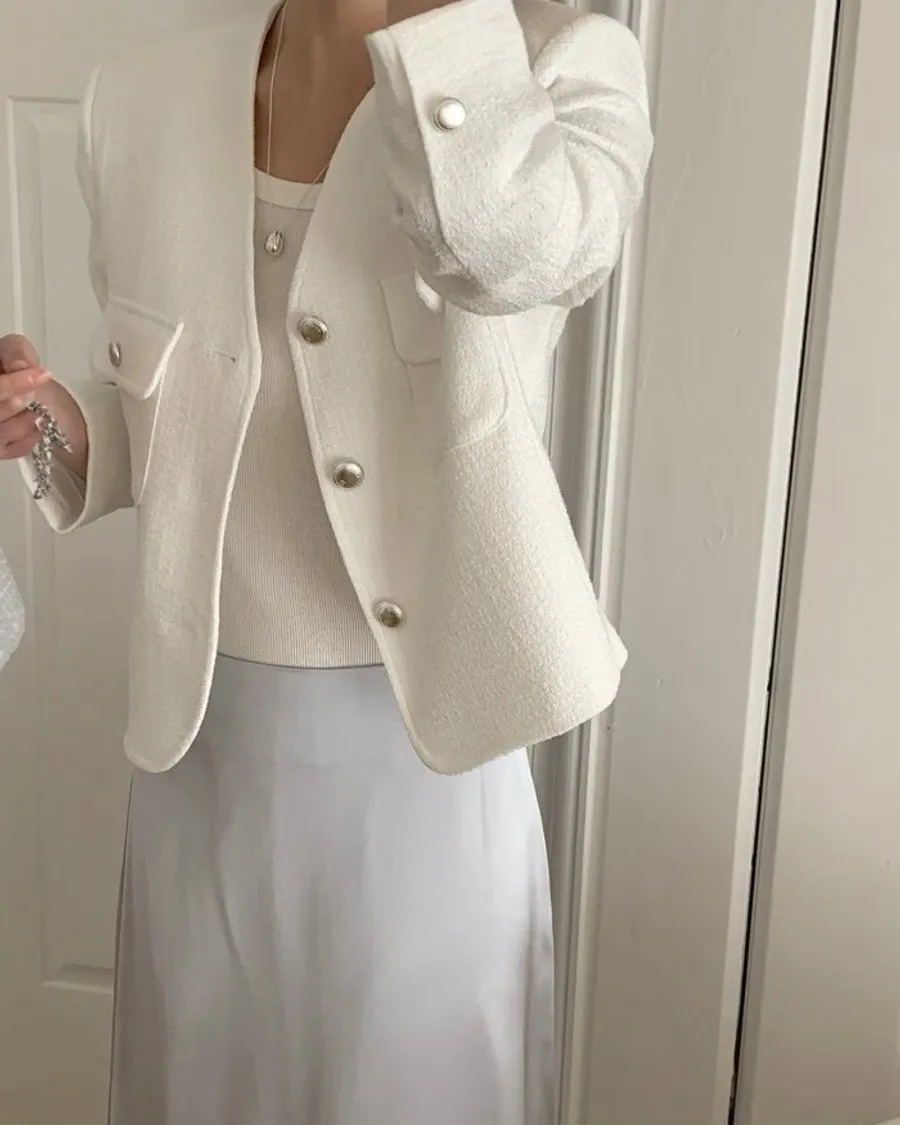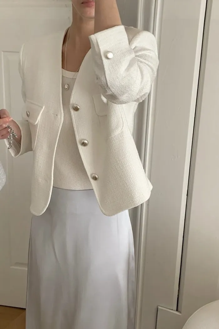 立體紋理面料帶出溫柔細緻的層次感,搭配精緻金屬釦與口袋細節,為整體造型增添一抹法式優雅。短版比例自然提升腰線,不論搭配裙裝、牛仔褲或西裝褲,都能輕鬆呈現修長比例與氣質穿搭。