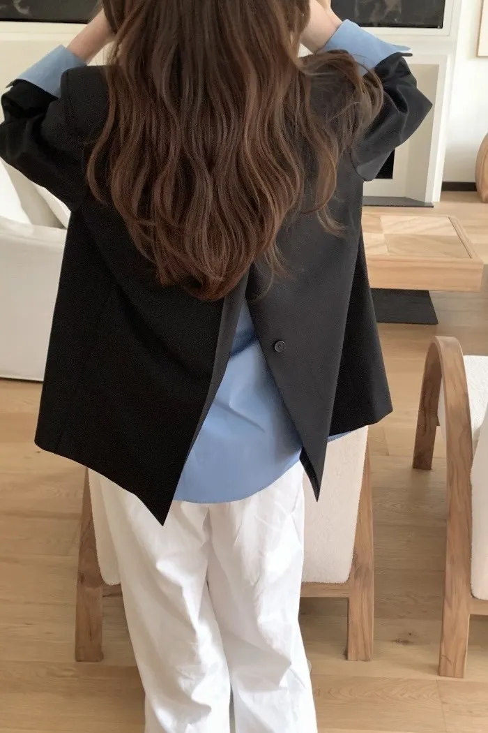 版型採用微寬鬆剪裁,保留西裝的俐落線條,同時兼顧舒適與修飾效果,能自然修飾肩線與身形比例。