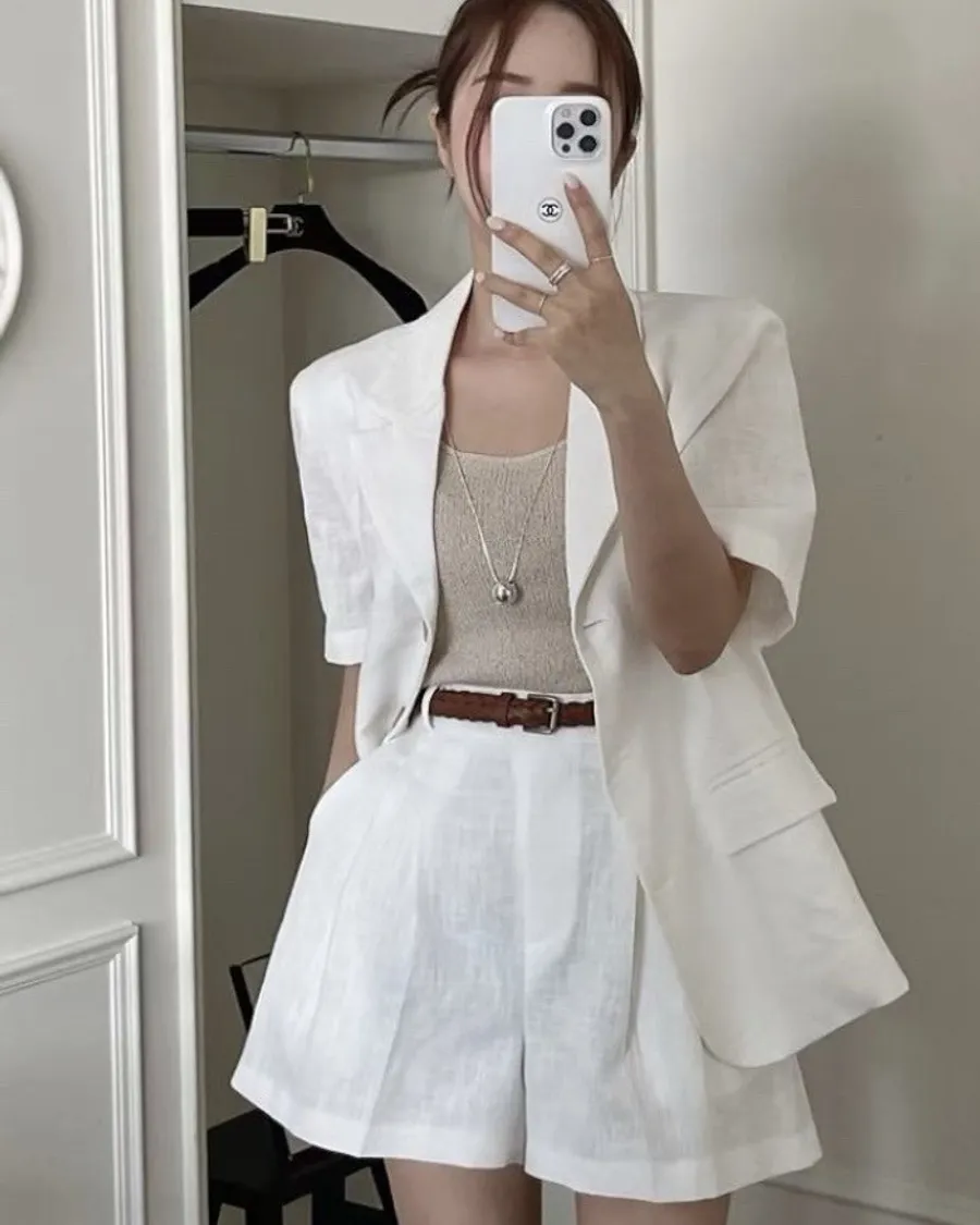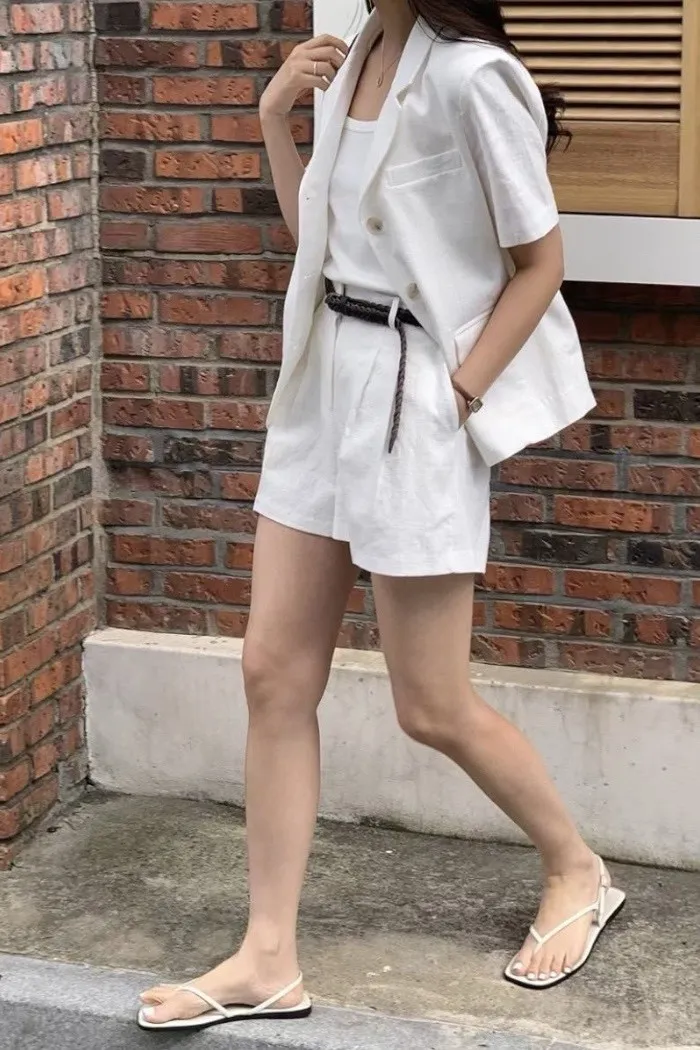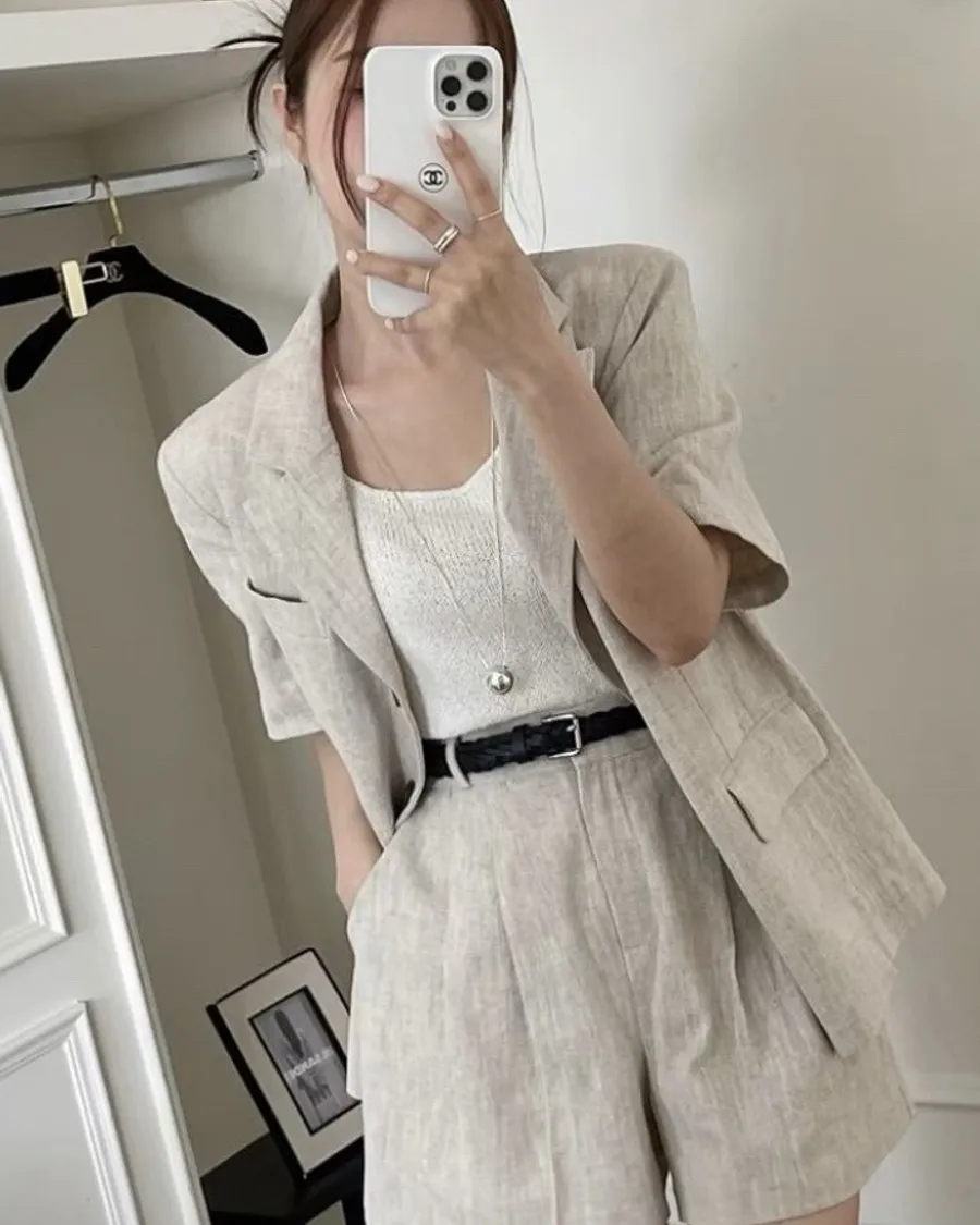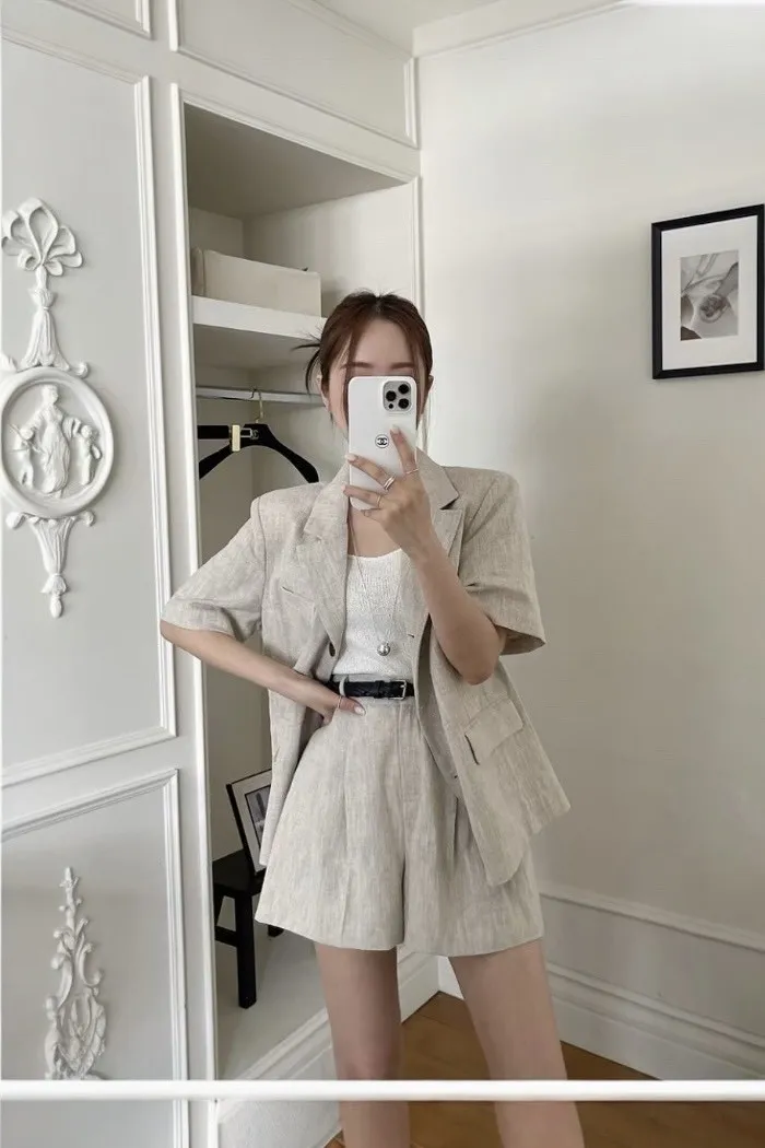 以輕盈亞麻面料為基底,結合俐落剪裁與柔和線條,打造一套兼具清爽與質感的夏日套裝