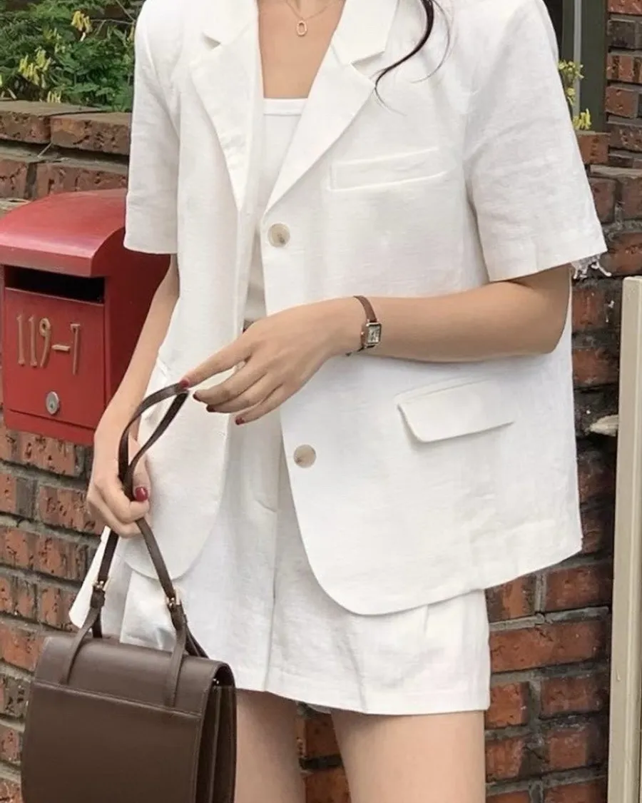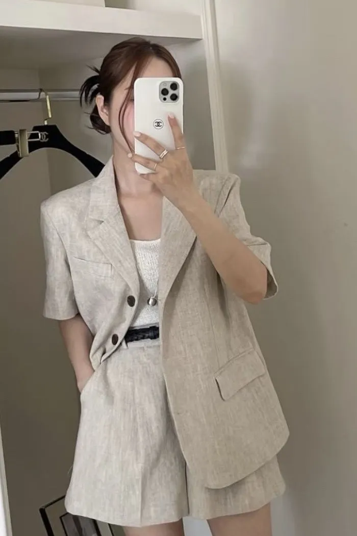 以輕盈亞麻面料為基底,結合俐落剪裁與柔和線條,打造一套兼具清爽與質感的夏日套裝 短版西裝外套採單排釦設計,線條簡潔乾淨,修飾肩線比例,穿上即呈現不費力的俐落感。內搭背心或簡約上衣,都能輕鬆堆疊出層次。