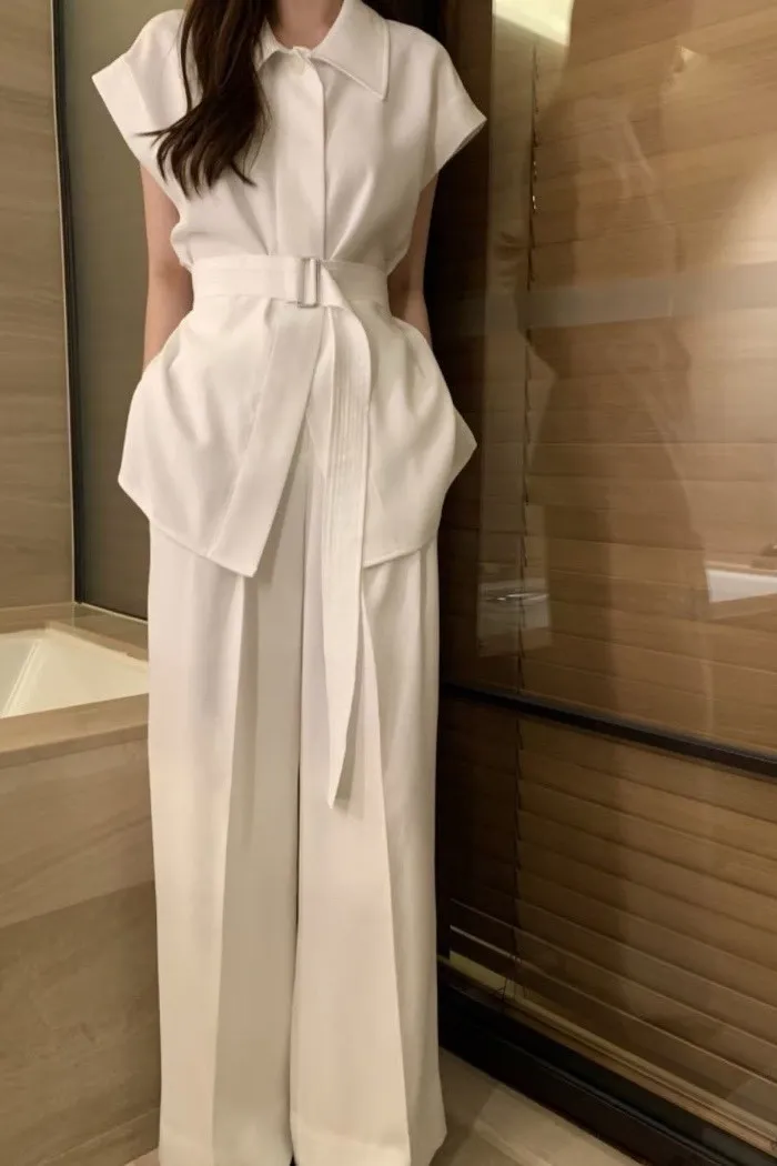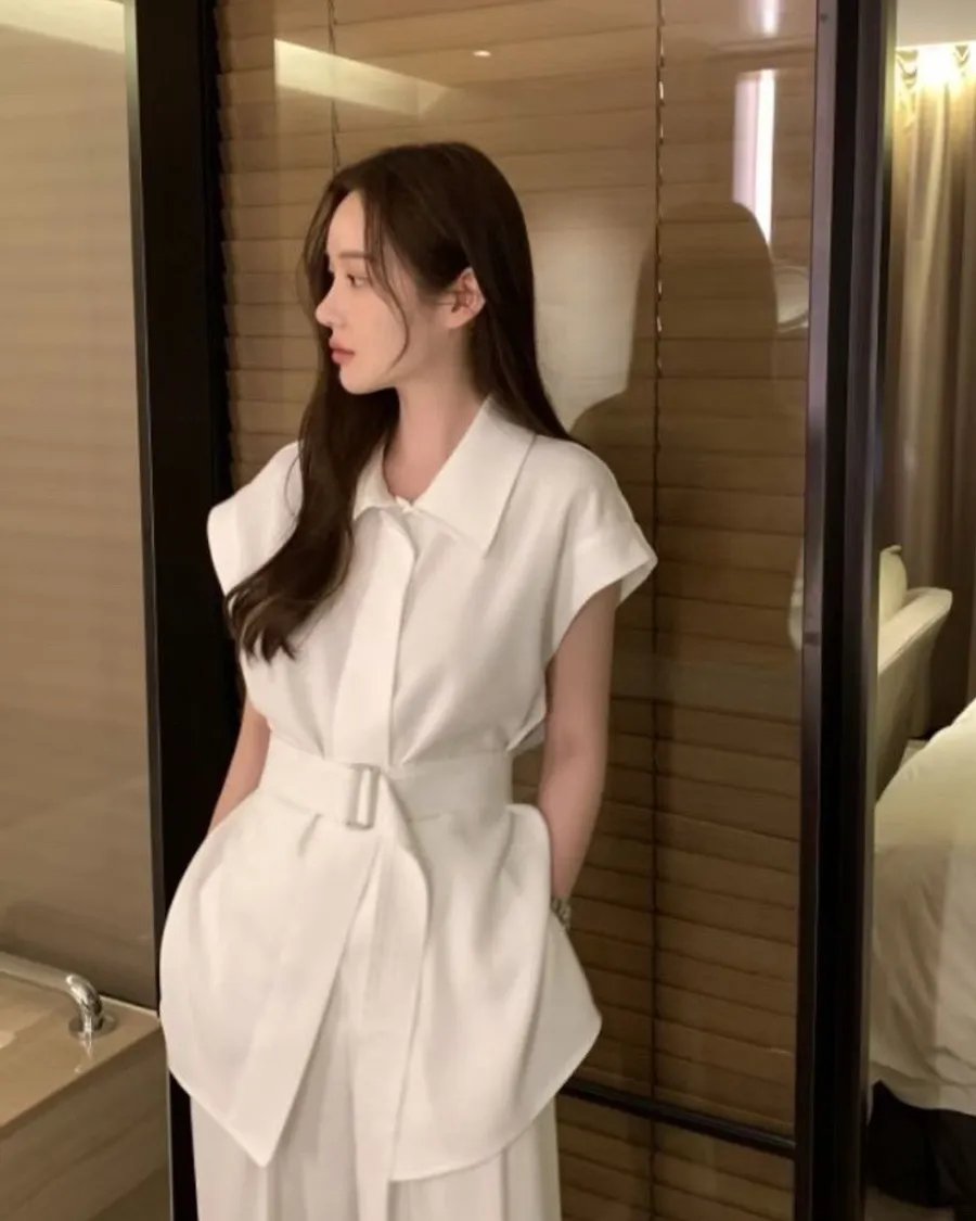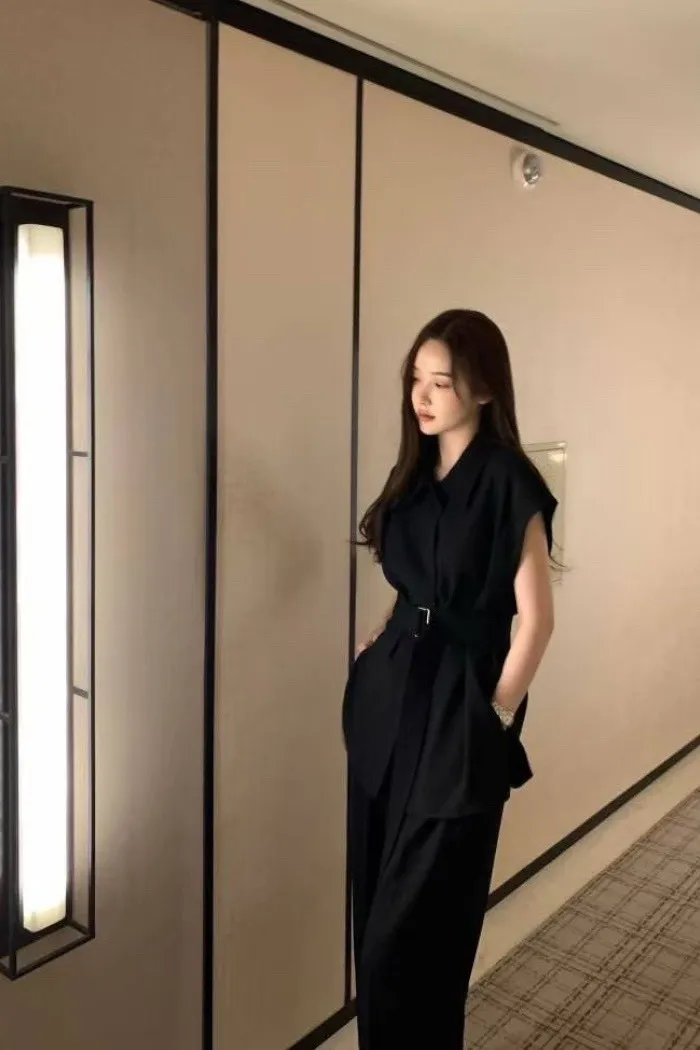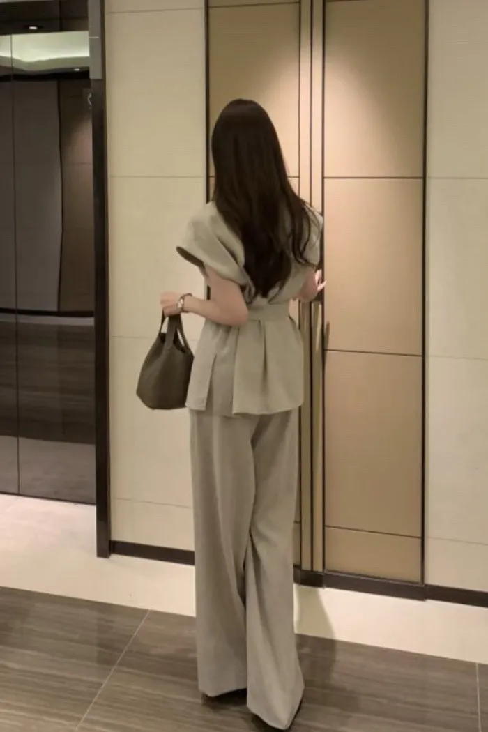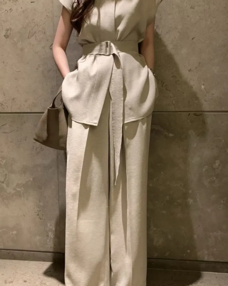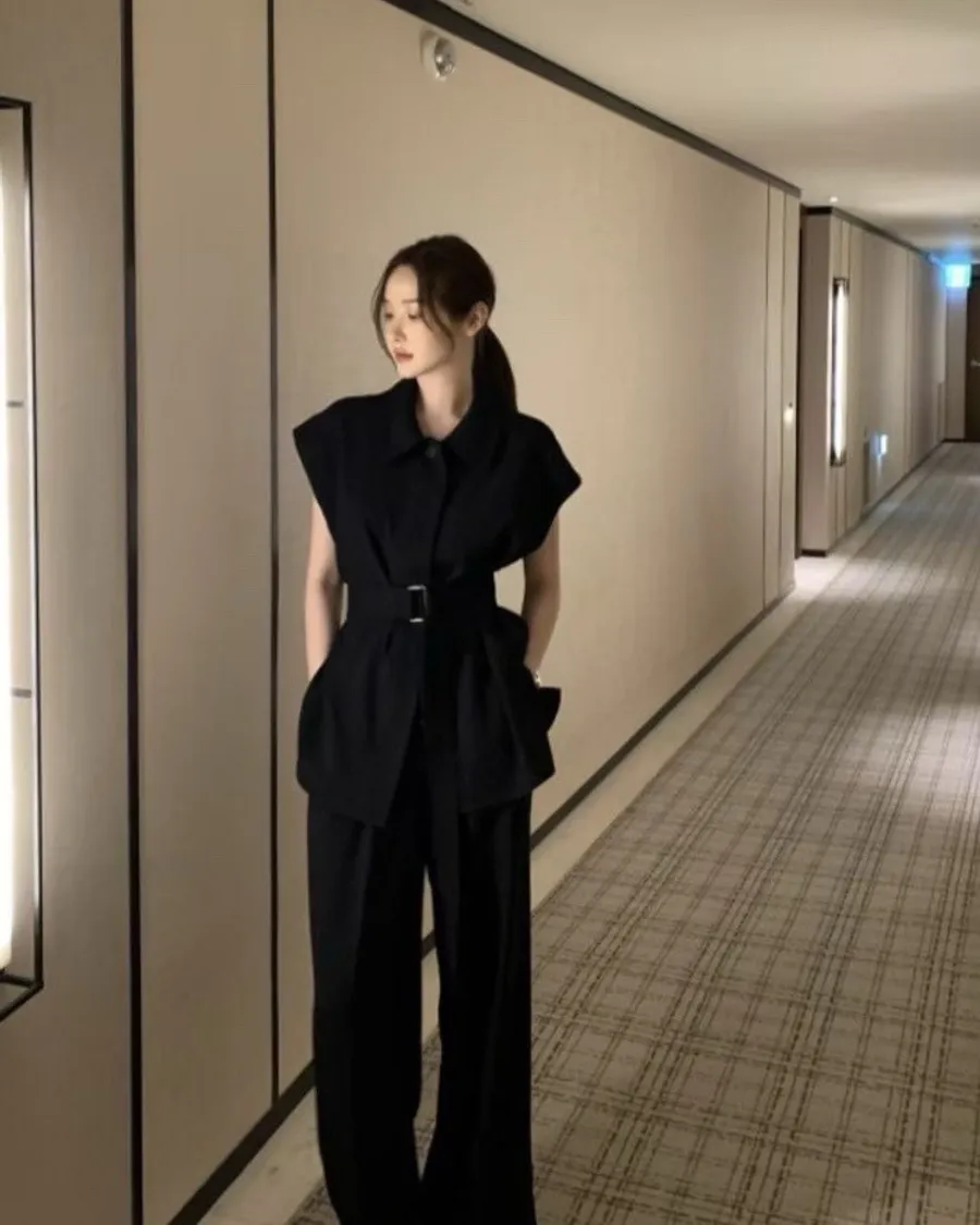 以俐落線條結合柔和垂墜面料,打造出兼具結構與流動感的現代套裝。整體以極簡設計為核心,透過剪裁與比例堆疊出自然延伸的身形輪廓,呈現低調卻不容忽視的高級氣場