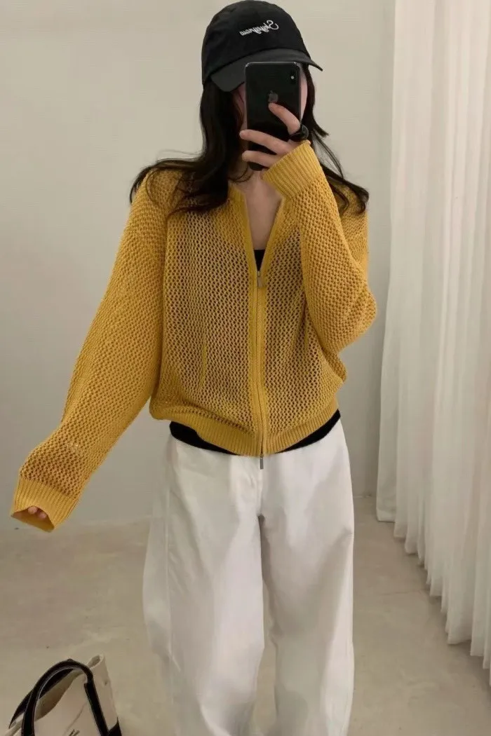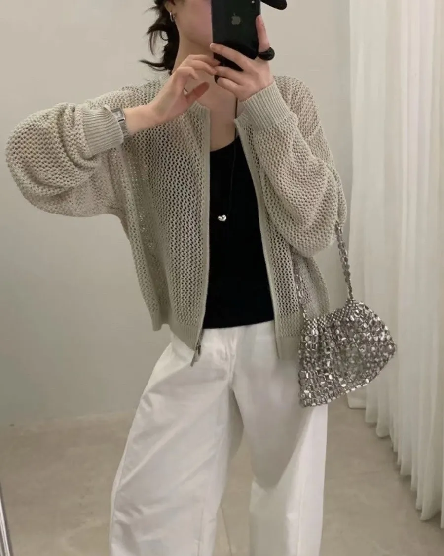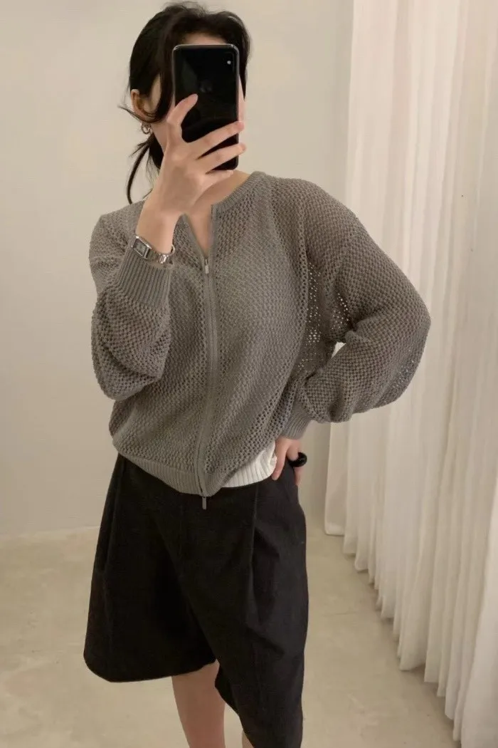 以輕盈鏤空針織面料打造,呈現自然透氣的穿著體驗,兼具清爽與造型感。細緻編織紋理帶出層次,使整體在簡約之中更顯質感。