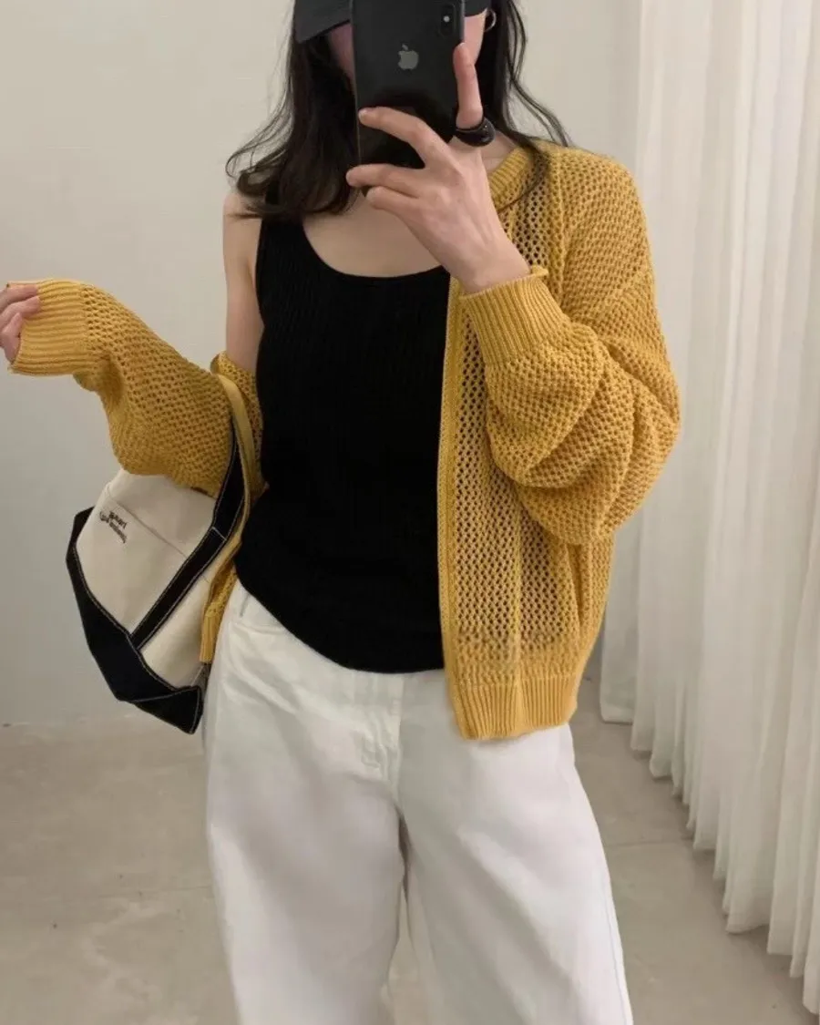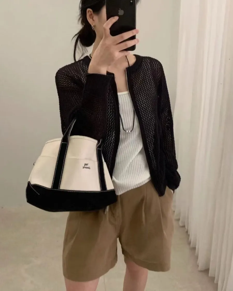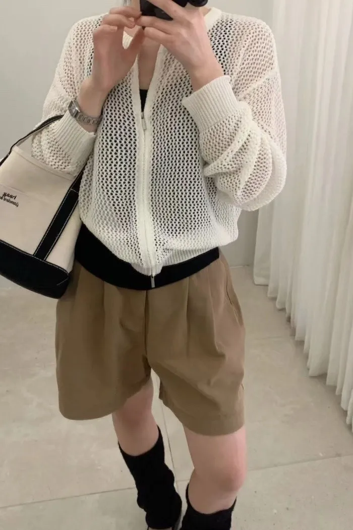 鏤空設計隱約透出內搭層次,無論搭配背心或短版上衣,都能營造出清爽且有層次的穿搭效果。