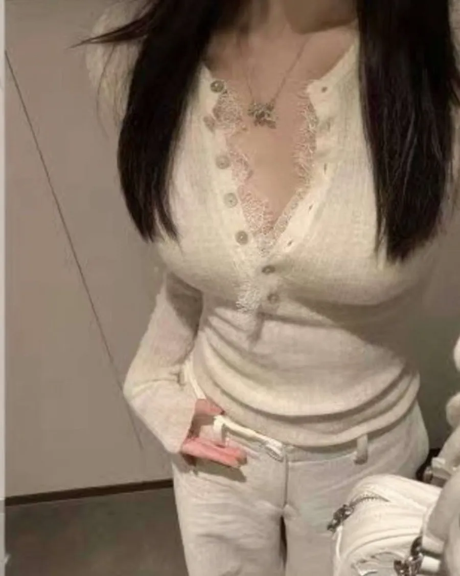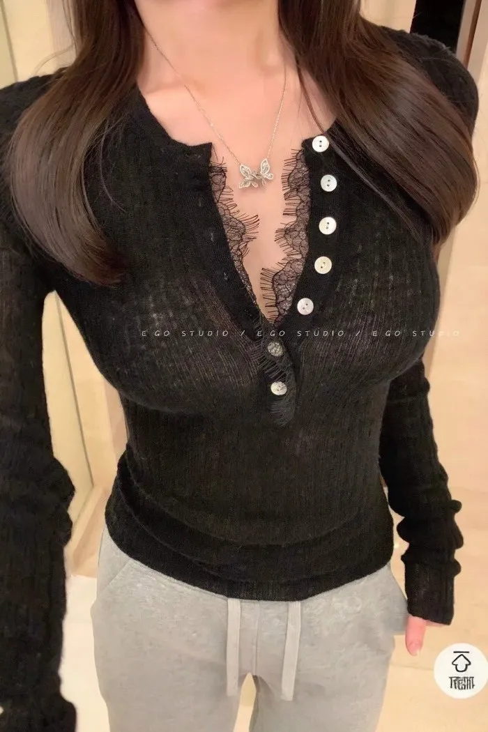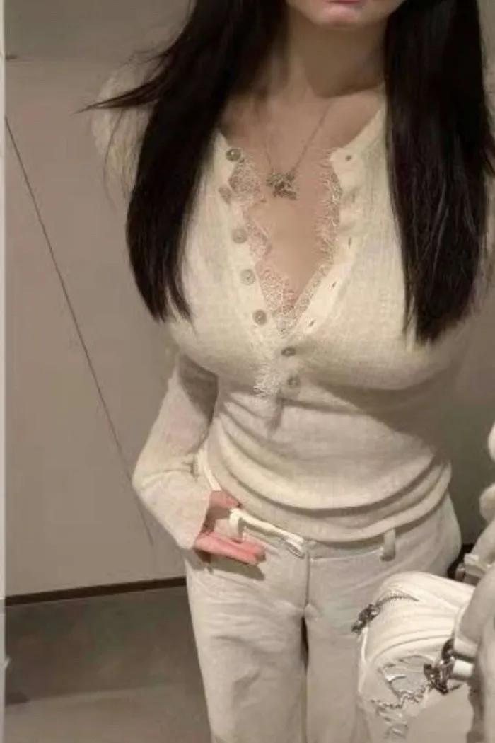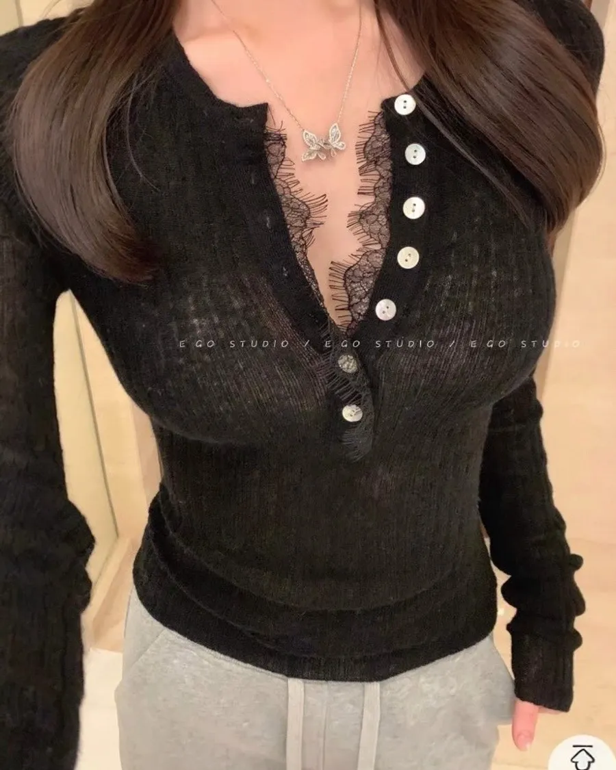 蕾絲滾邊修身開扣針織上衣