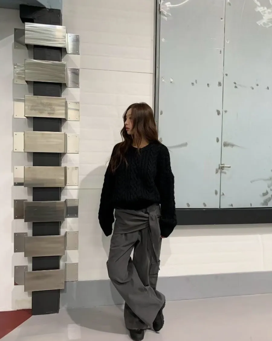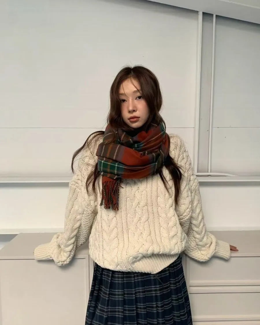 這款毛衣是那種「穿上去就會被誇」的冬季必備款。厚而不重的立體扭織編紋,讓整件毛衣看起來 溫柔、有份量、超級耐看,隨便搭都能營造冬天的暖暖氛圍感。