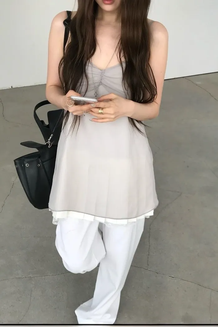 以柔和線條與輕透層次為核心,打造一款在簡約中帶有細節的背心式上衣佯裝